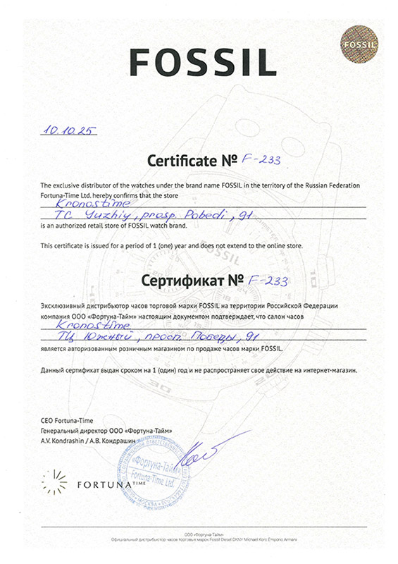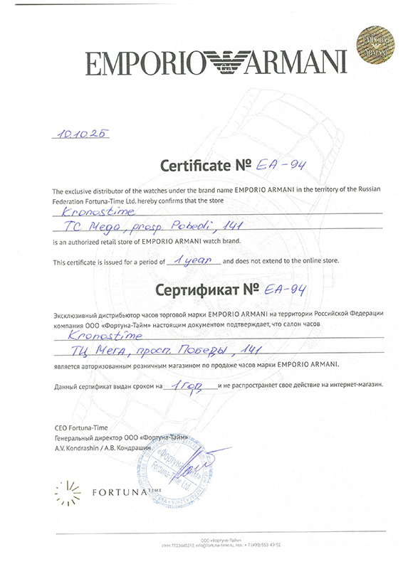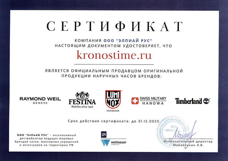 Наша компания является официальным дилером более 100 известных брендов часов, включая премиальные марки TAG Heuer, Breitling, Longines и другие. Мы предоставляем официальные сертификаты, которые подтверждают право на реализацию оригинальной продукции и гарантируют подлинность каждого проданного товара.