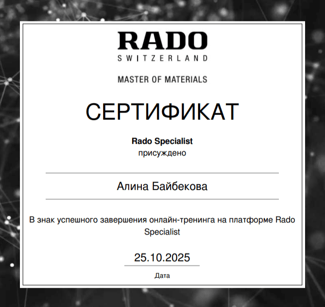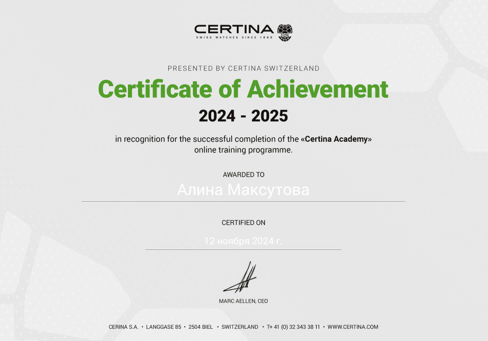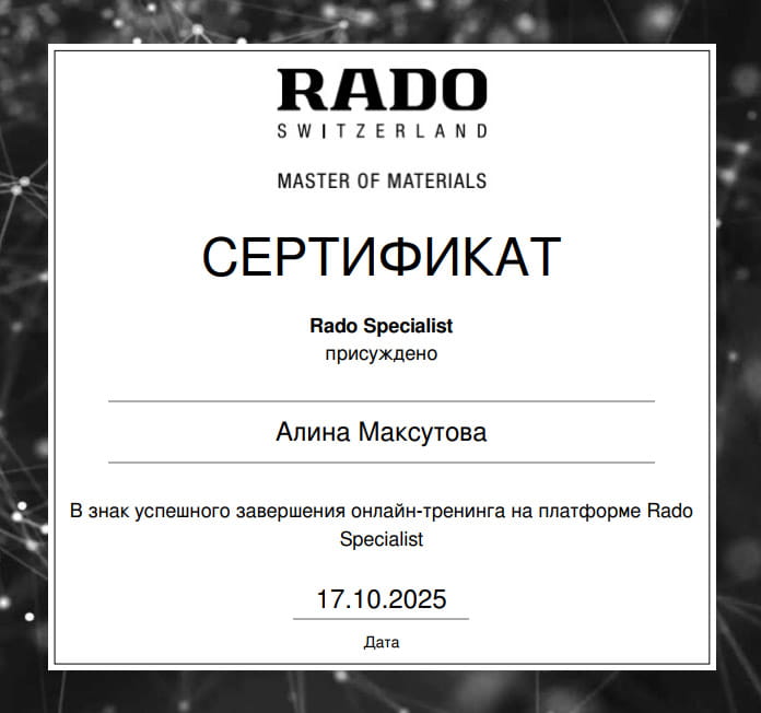 Наши консультанты проходят обязательную сертификацию у ведущих производителей часов, таких как Tissot, Longines, Rado, Certina, Hamilton, Mido и Casio. Это подтверждает их высокий уровень профессионализма и компетенций, необходимых для работы с оригинальной продукцией.