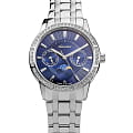 Женские часы Adriatica Moonphase A3601.5115QFZ имеют кварцевый механизм с высокой точностью. Сапфировое стеклоСапфировое стеклоПрочный и надёжный материал из кристалла сапфира синтетического происхождения, характеризующийся особой твёрдостью и устойчивостью к царапинам и повреждениям. устойчивое к появлению царапин, обладающее высокой прозрачностью, защищает изящный синий циферблат. Корпус часов изготовлен из нержавеющей стали, на безелеБезельВнешний ободок, закрепляющий стекло. В спортивных часах так называется поворотное кольцо с делениями на циферблате, выполняет роль таймера – замеряет отрезки времени на шкале. Неподвижный безель – элемент декора. Однонаправленно вращающийся безель на дайверских часах позволяет фиксировать моменты погружения и выныривания на поверхность. расположились фианиты, что придает часам утонченный и стильный вид.  Браслет из нержавеющей стали с раскладной застёжкойРаскладная застёжкаТакой тип застёжки используется только на браслетах из металла. Она никогда не раскрывается полностью, происходит разделение на 2 и более частей. Раскладывающая застёжка снизит вероятность потери часов к минимуму., гармонично дополняет общий дизайн и обеспечивает комфортное ношение на запястье. Надежный кварцевый механизм с калибром RONDA 706 гарантирует точность времени, а водозащита 50 метров, что позволит защитить корпус от случайных брызг или капель дождя. Часы оснащены тремя дополнительными циферблатами с функциями отображения числа месяца, дня недели и фазы Луны, что придает им неповторимый характер.