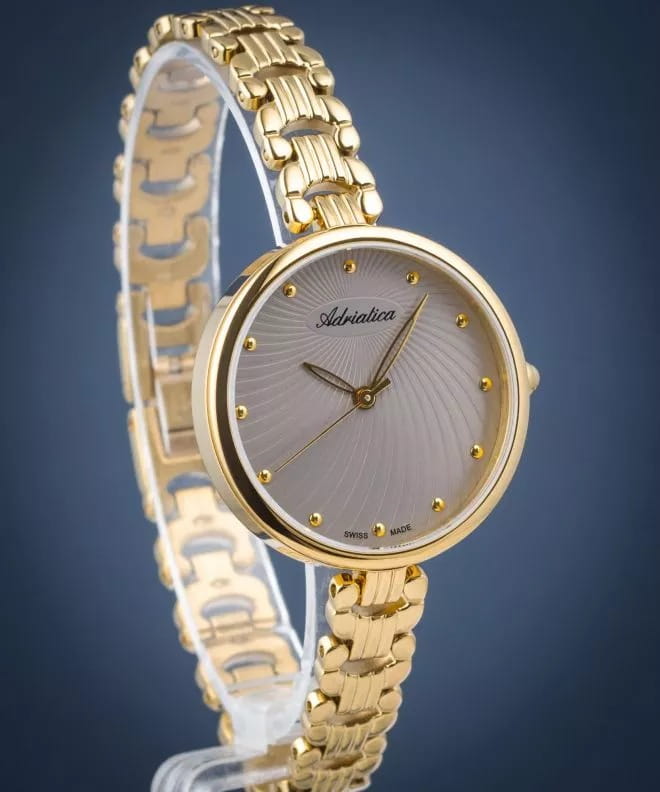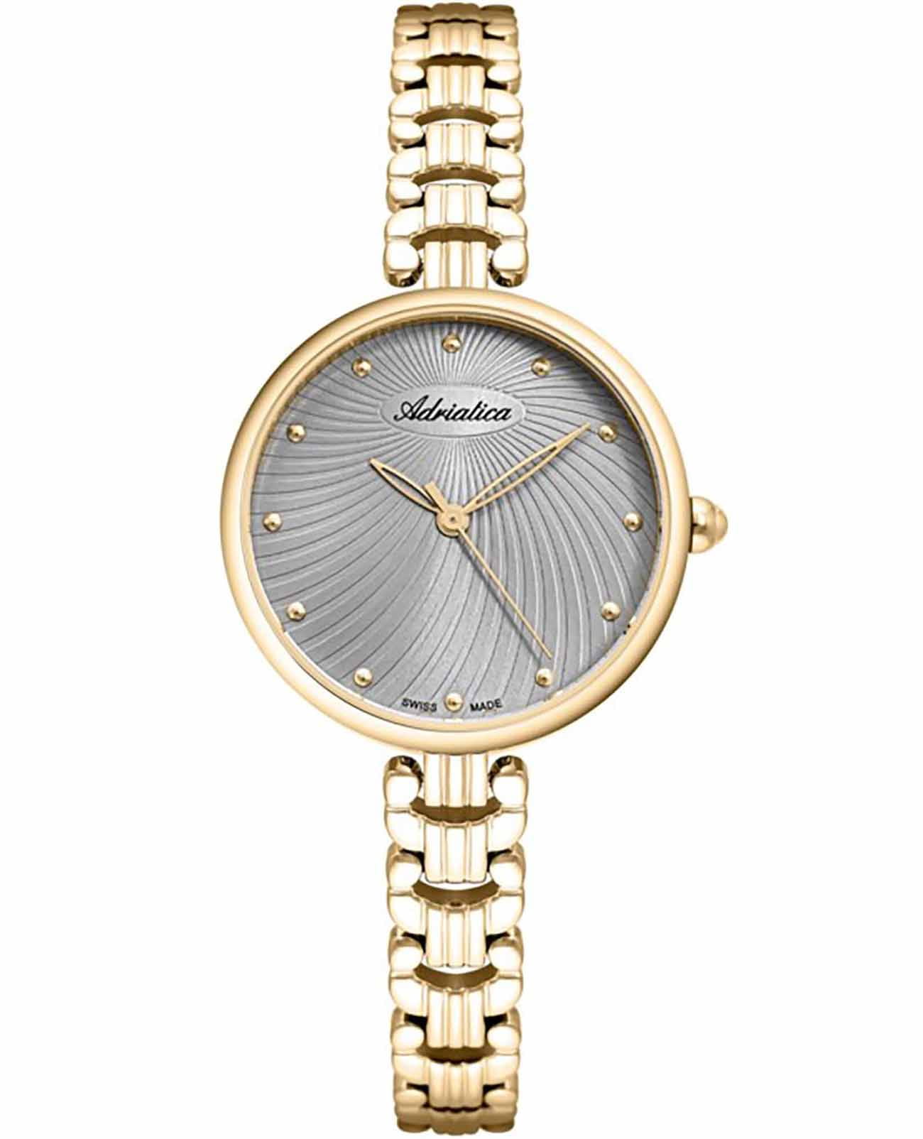 Изысканные женские часы Adriatica A3822.1147Q, произведенные в Швейцарии. Эти часы идеально подойдут для женщин, ценящих элегантность и стиль. Часы оснащены надежным кварцевым механизмом Ronda 763, обеспечивающим точность и долговечность. Корпус диаметром 30 мм и толщиной 7 мм выполнен из стали с PVDPVDУльтратонкое покрытие наносится в технике вакуумного напыления, сочетает в себе нитрид титана особой прочности со слоем золота или оксида хрома. Несёт в себе декоративную или защитную функцию. покрытием, что придает часам современный и утонченный вид. Серый циферблат, украшенный точками, придает дополнительную изысканность. Минеральное стеклоМинеральное стеклоМинеральное стекло представляет собой искусственно выращенный минерал кварца. Такое стекло отличается особой устойчивостью к повреждениям и царапинам. Уступает по некоторым качествам сапфировому стеклу. защищает циферблат от повреждений, а водозащита уровня 30WR позволяет использовать часы в условиях легкой влажности. Стальной браслет с PVDPVDУльтратонкое покрытие наносится в технике вакуумного напыления, сочетает в себе нитрид титана особой прочности со слоем золота или оксида хрома. Несёт в себе декоративную или защитную функцию. покрытием золотистого цвета с ювелирной застежкой обеспечивает комфортное ношение и надежную фиксацию на запястье.