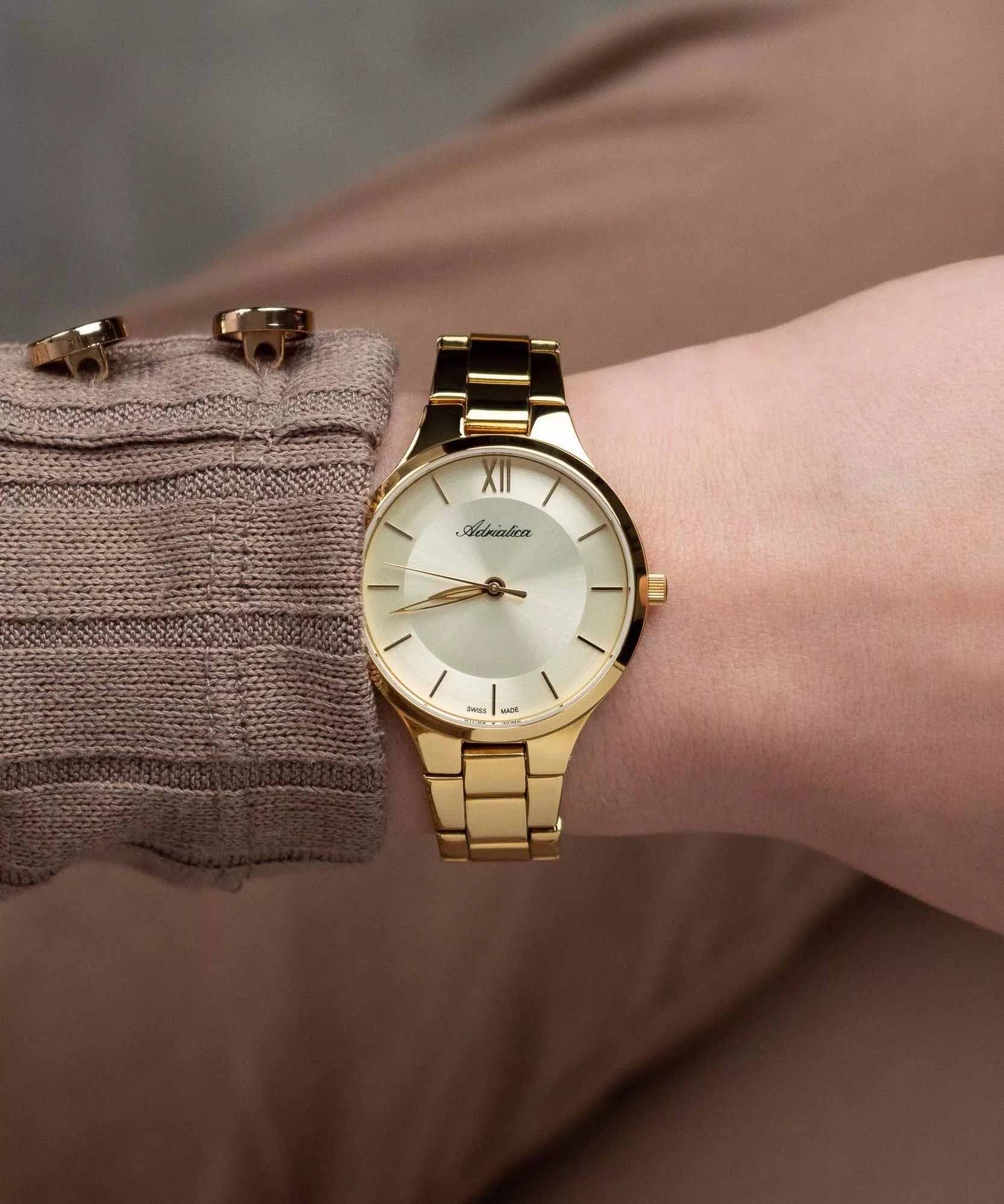 Женские кварцевые часы Adriatica A3823.1161Q — это элегантный аксессуар швейцарского производства с корпусом круглой формы. Корпус и браслет выполнены из стали с PVD-покрытиемPVDУльтратонкое покрытие наносится в технике вакуумного напыления, сочетает в себе нитрид титана особой прочности со слоем золота или оксида хрома. Несёт в себе декоративную или защитную функцию. и защищены минеральным стекломМинеральное стеклоМинеральное стекло представляет собой искусственно выращенный минерал кварца. Такое стекло отличается особой устойчивостью к повреждениям и царапинам. Уступает по некоторым качествам сапфировому стеклу.. Циферблат шампань с эффектом Sunray (солнечные лучи) оформлен штрихами и римской цифрой 12, что придаёт модели изысканный вид. Браслет фиксируется на раскладной застёжкеРаскладная застёжкаТакой тип застёжки используется только на браслетах из металла. Она никогда не раскрывается полностью, происходит разделение на 2 и более частей. Раскладывающая застёжка снизит вероятность потери часов к минимуму.. Часы оснащены точным кварцевым механизмом калибра Ronda 783. Водонепроницаемость 30 м позволит защитить корпус от случайных брызг или капель дождя.
