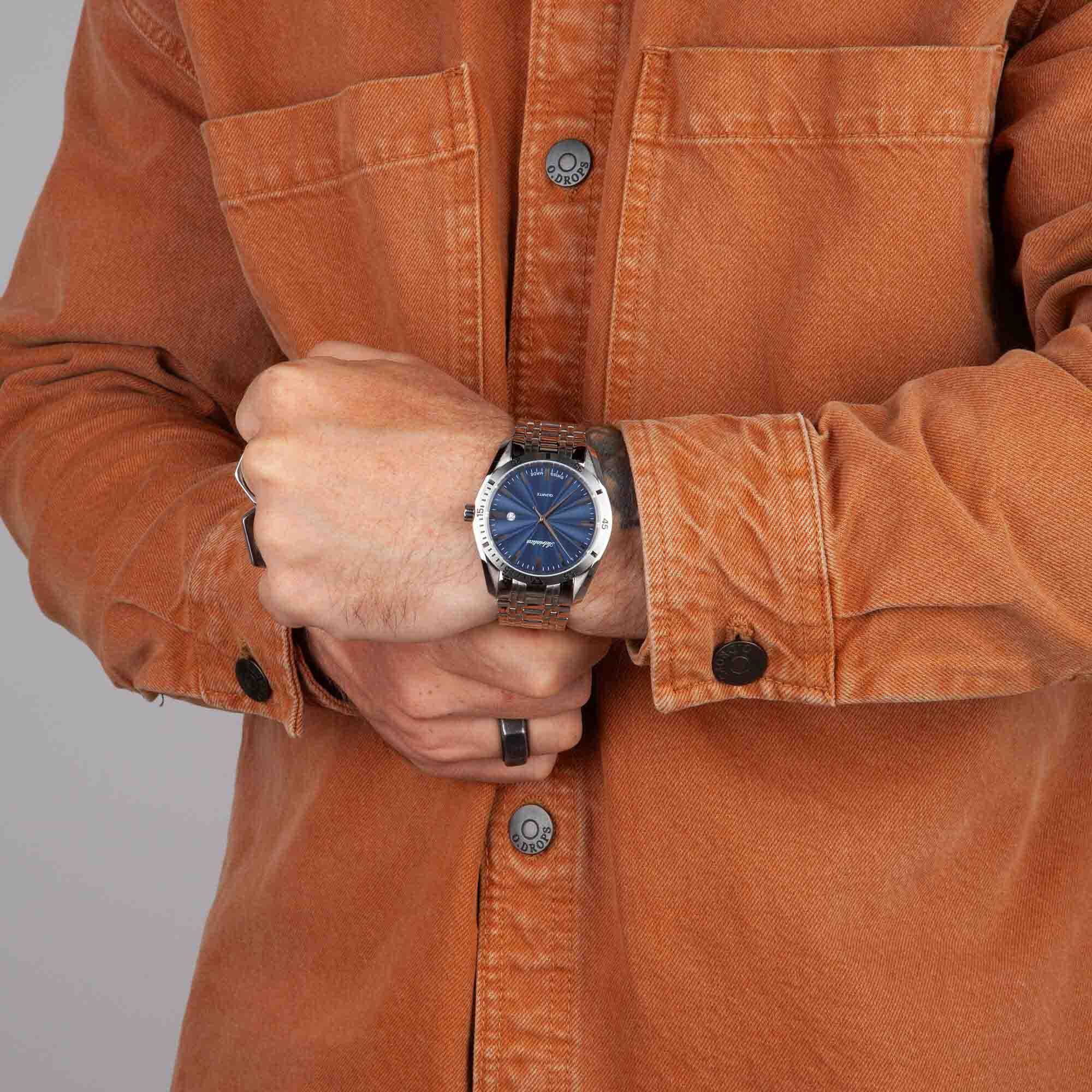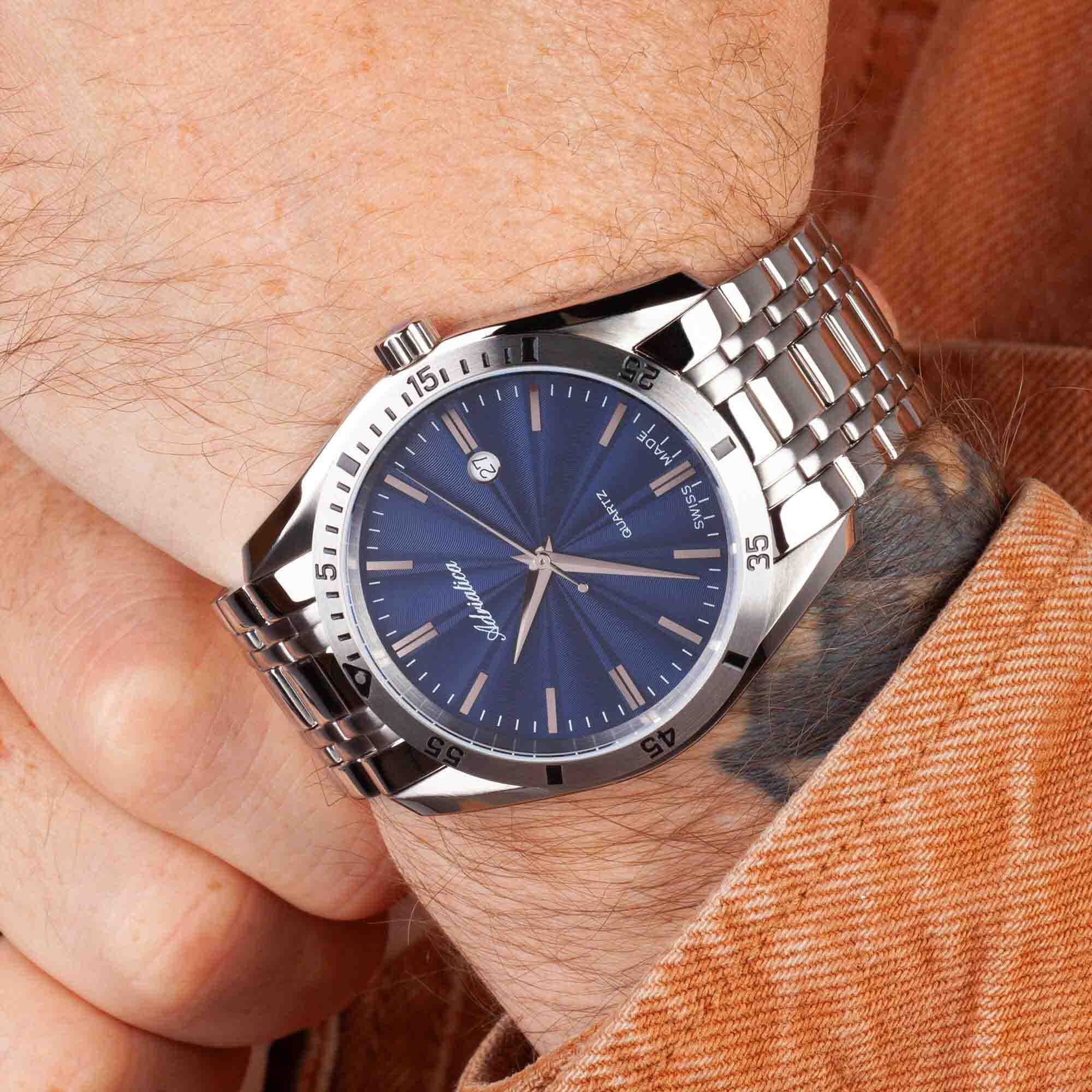 Мужские кварцевые часы Adriatica A8202.5115Q — это гармоничное сочетание классических элементов, элегантности и практичности. Часы оснащены механизмом ETA F06, обеспечивающим высокую точность хода. Корпус круглой формы выполнен из нержавеющей стали и защищён сапфировым стекломСапфировое стеклоПрочный и надёжный материал из кристалла сапфира синтетического происхождения, характеризующийся особой твёрдостью и устойчивостью к царапинам и повреждениям.. Циферблат синего цвета выполнен по технологии Sunray с гильошированной текстурой и дополнен штриховыми метками, стрелки — в классическом стиле Dauphine. На безеле нанесена минутная шкала, что придаёт модели функциональности. Окошко даты расположено в положении 3 часа. Браслет из нержавеющей стали фиксируется на раскладной застёжкеРаскладная застёжкаТакой тип застёжки используется только на браслетах из металла. Она никогда не раскрывается полностью, происходит разделение на 2 и более частей. Раскладывающая застёжка снизит вероятность потери часов к минимуму., обеспечивая надёжность и удобство ношения. Водонепроницаемость 50 м позволяет использовать часы в повседневных условиях, защищая от случайных брызг и капель дождя. Модель подчёркивает индивидуальность и хороший вкус владельца, оставаясь универсальным аксессуаром для любого случая.