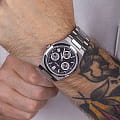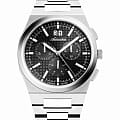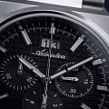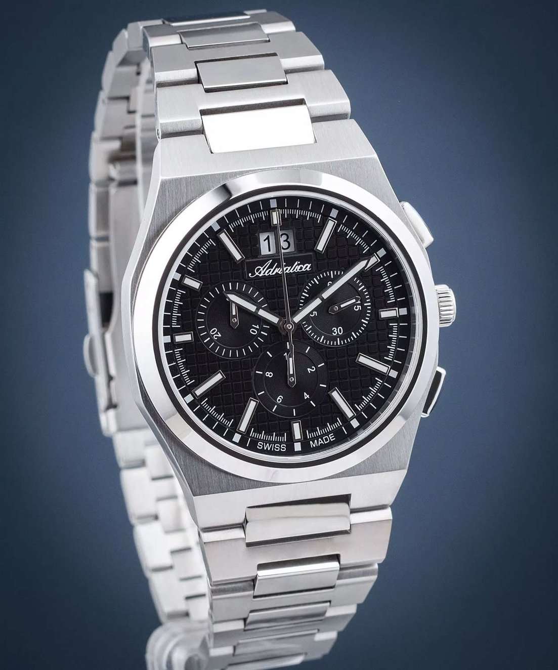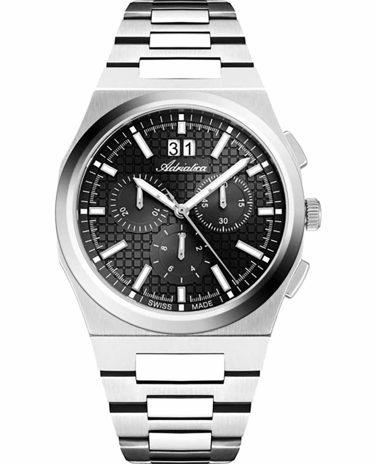 Мужские швейцарские часы-хронографХронографФункция позволяет измерять отрезки времени с особой точностью: часы, минуты, секунды. Верным признаком хронографа является наличие на циферблате 3 дополнительных окошек-счётчиков. с секундомеромСекундомерСекундоме́р — прибор, способный измерять интервалы времени с точностью до долей секунды.  Adriatica Premiere A8326.5114CH воплощают в себе элегантность и функциональность, идеально подходящие для современных мужчин, ценящих швейцарское качество. Их черный циферблат защищенный сапфировым стекломСапфировое стеклоПрочный и надёжный материал из кристалла сапфира синтетического происхождения, характеризующийся особой твёрдостью и устойчивостью к царапинам и повреждениям., заключен в корпус из нержавеющей стали диаметром 40 мм и толщиной 10 мм. Надежный кварцевый механизм с калибром Ronda 5040.B обеспечивает высокую точность, а водозащита 5 ATM делает часы устойчивыми к воздействию воды. Стальной браслет с раскладной застёжкойРаскладная застёжкаТакой тип застёжки используется только на браслетах из металла. Она никогда не раскрывается полностью, происходит разделение на 2 и более частей. Раскладывающая застёжка снизит вероятность потери часов к минимуму. обеспечивает комфортное и надежное ношение. Фактурный циферблат с метками в виде штрихов дополнен рисунком в клетку, а окошко даты находится в положении 12 часов, что добавляет практичности в повседневной жизни. Люминесцентное покрытиеЛюминесцентное покрытиеПозволяет считывать показания времени в темноте. Производители наносят на стрелки, часовые индексы, безель или поверхность циферблата светонакопительный состав, дающий холодное свечение. на стрелках и метках обеспечивает отличную видимость в темноте.