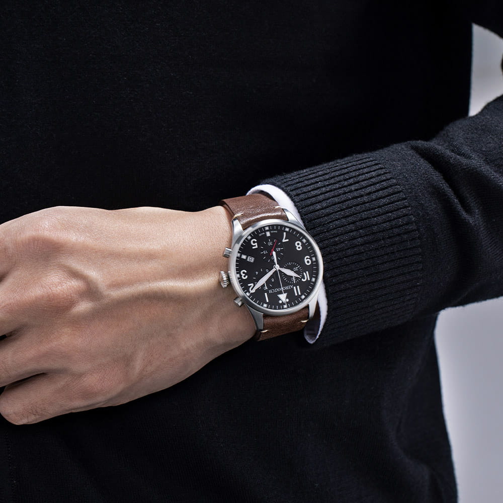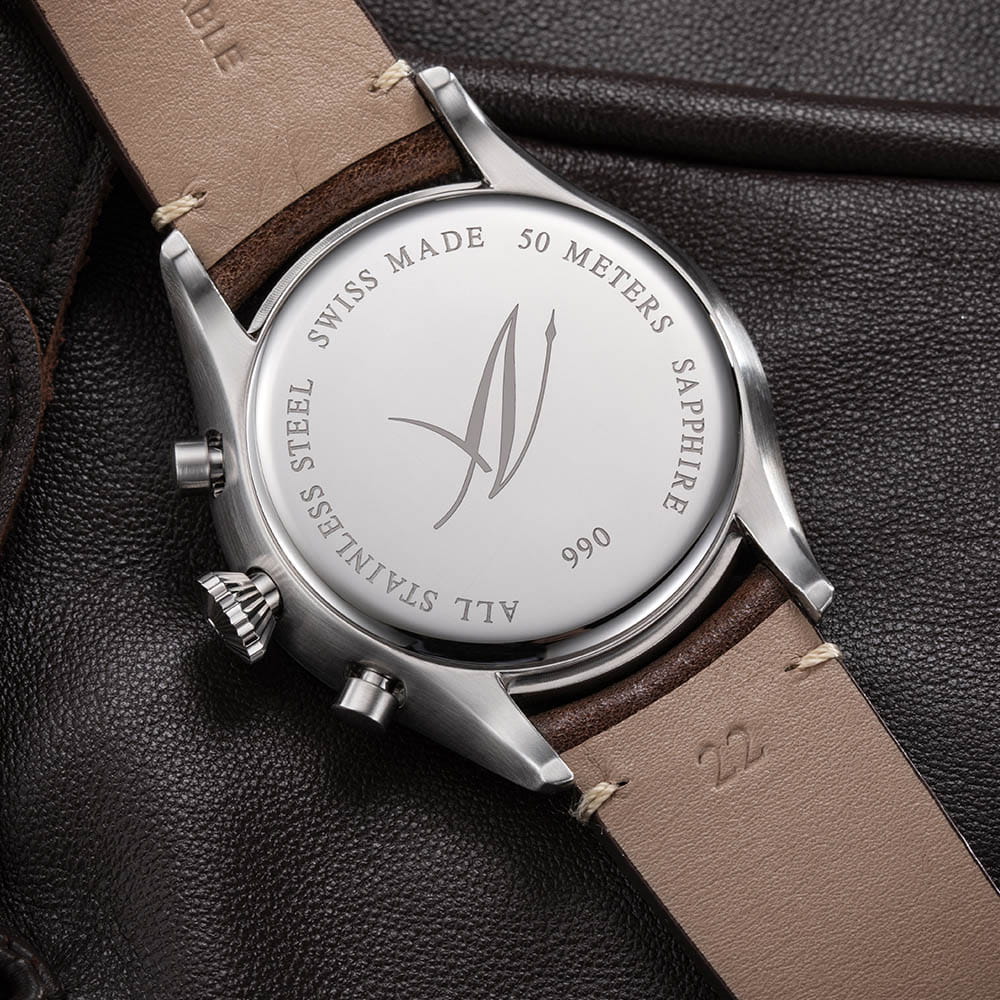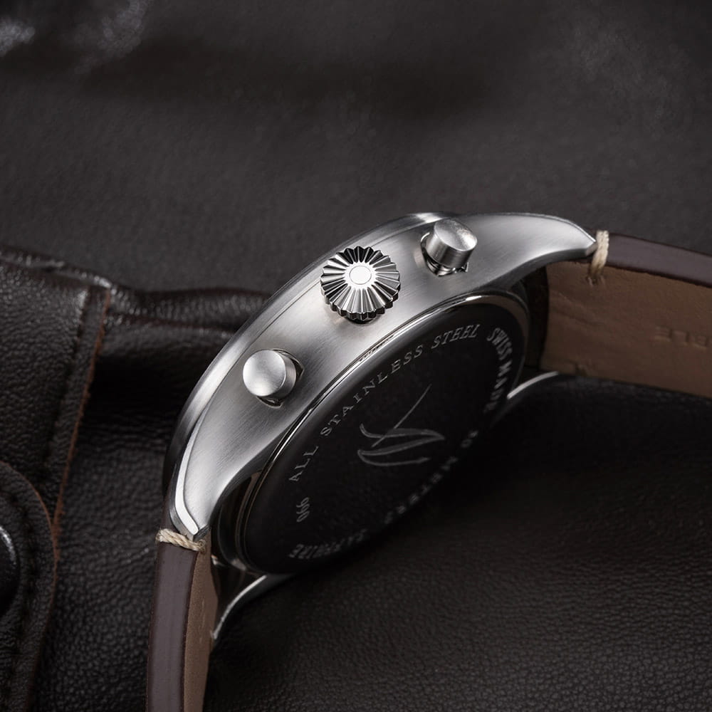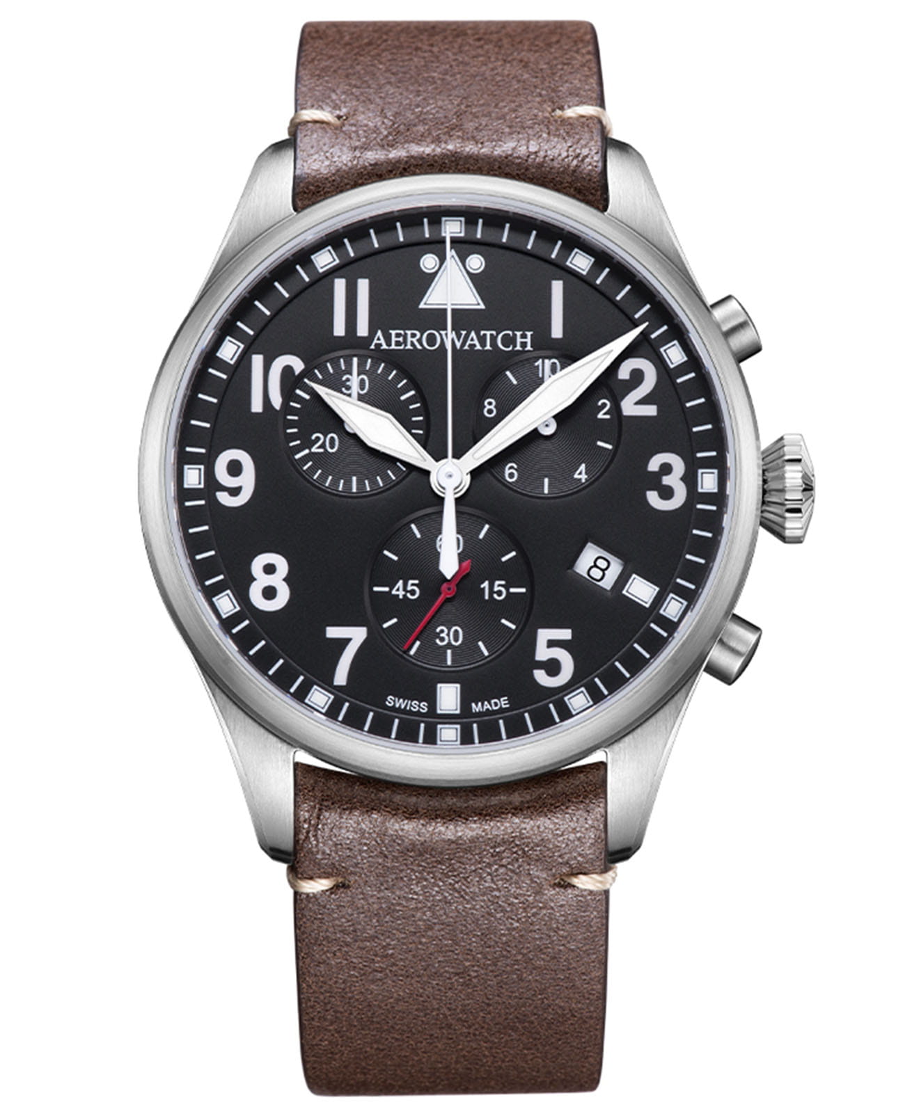 Мужские швейцарские часы-хронографХронографФункция позволяет измерять отрезки времени с особой точностью: часы, минуты, секунды. Верным признаком хронографа является наличие на циферблате 3 дополнительных окошек-счётчиков. Aerowatch Les Grandes Classiques 79990 AA03, кварцевый механизм с высокой точностью. Сапфировое стеклоСапфировое стеклоПрочный и надёжный материал из кристалла сапфира синтетического происхождения, характеризующийся особой твёрдостью и устойчивостью к царапинам и повреждениям. устойчивое к появлению царапин, обладающее высокой прозрачностью. Корпус изготовлен из нержавеющей стали. На циферблате 3 счетчика, стрелки и метки с люминесцентным покрытиемЛюминесцентное покрытиеПозволяет считывать показания времени в темноте. Производители наносят на стрелки, часовые индексы, безель или поверхность циферблата светонакопительный состав, дающий холодное свечение., окошко даты в положении 4 часов. Класс водозащиты: 50 метров, позволит защитить корпус от случайных брызг или капель дождя. Кожаный ремешок на стандартной застёжке.