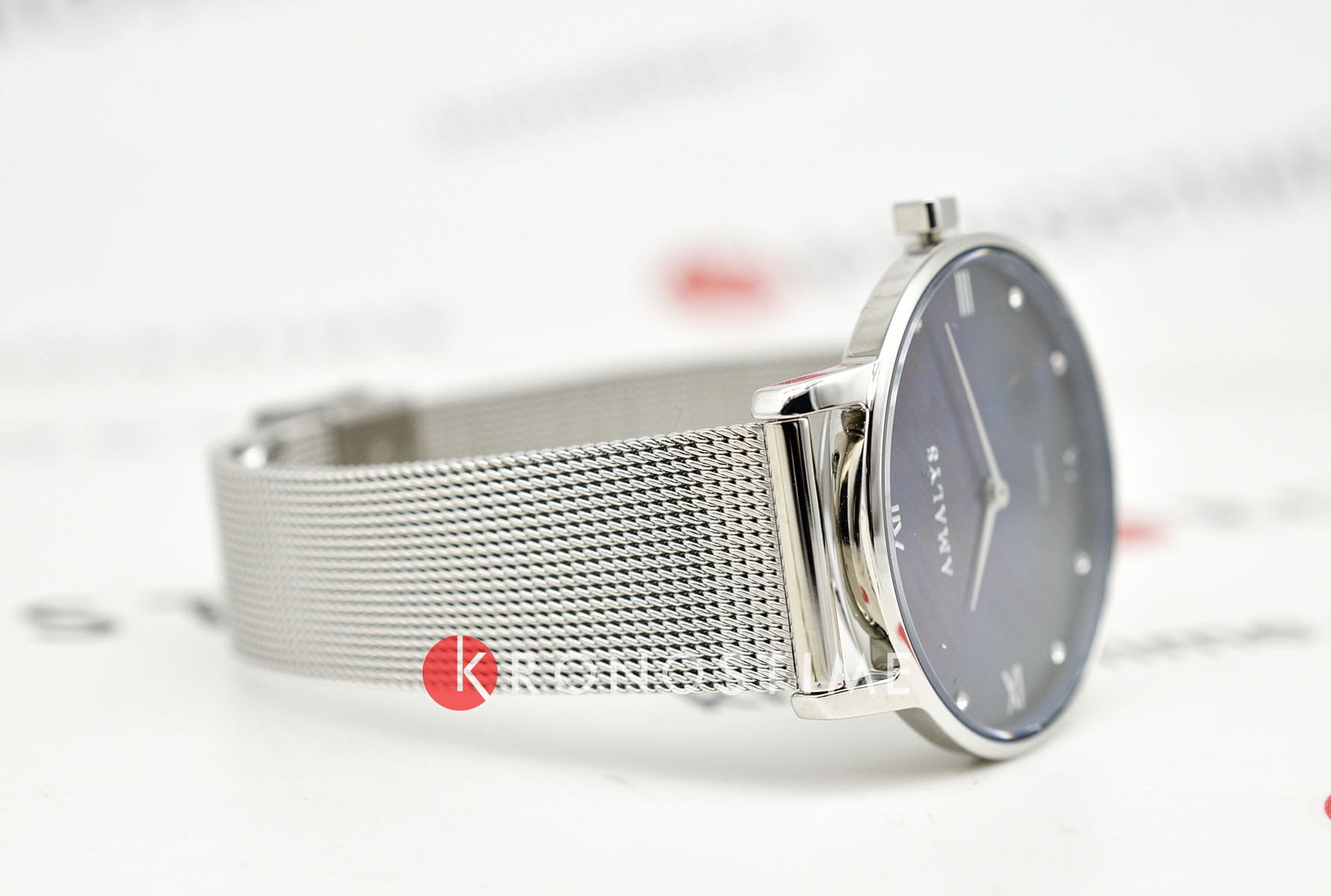 Amalys AMW-185 — женская модель с утончённым классическим дизайном, в которой сочетаются элегантность и практичность. Круглый корпус диаметром 33 мм выполнен из нержавеющей стали, гармонирующим с браслетом шириной 16 мм в том же исполнении. Защитную функцию выполняет сапфировое стеклоСапфировое стеклоПрочный и надёжный материал из кристалла сапфира синтетического происхождения, характеризующийся особой твёрдостью и устойчивостью к царапинам и повреждениям., стойкое к царапинам и сохраняющее прозрачность. Механизм — кварцевый, обеспечивающий точность и стабильность хода. Стальной браслет миланского плетения на раскладном замкеРаскладной замокДанный вариант застежки используется только на часах с металлическим браслетом. Отличительная особенность такого крепления в том, что длина браслета становится универсальной и вы можете самостоятельно отрегулировать нужный вам размер – застежка просто двигается по браслету часов. который сочетает надёжность фиксации и удобство повседневного использования. Водозащита 3 ATM защищает часы от случайных брызг и дождя. Циферблат с римскими индексами и изящными стрелками подчёркивает классическую эстетику модели, делая её уместной как в повседневных образах, так и в торжественной обстановке.