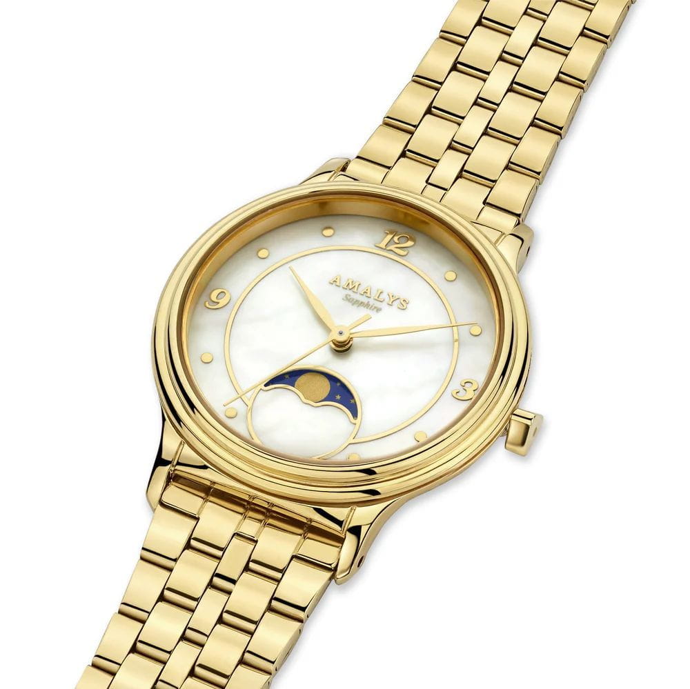 Amalys AMW-202 — женская модель с элегантным классическим стилем и утончёнными деталями. Круглый корпус изготовлен из нержавеющей стали с PVDPVDУльтратонкое покрытие наносится в технике вакуумного напыления, сочетает в себе нитрид титана особой прочности со слоем золота или оксида хрома. Несёт в себе декоративную или защитную функцию.-покрытием золотистого оттенка и гармонирует с браслетом в том же исполнении, состоящим из звеньев и обеспечивающим комфортное прилегание к запястью. Защитную функцию выполняет сапфировое стеклоСапфировое стеклоПрочный и надёжный материал из кристалла сапфира синтетического происхождения, характеризующийся особой твёрдостью и устойчивостью к царапинам и повреждениям., которое отличается стойкостью к царапинам и сохраняет высокую прозрачность. В основе лежит кварцевый механизм, гарантирующий точность хода и простоту эксплуатации. Циферблат украшен изящными арабскими цифрами и метками, дополнен утончённым индикатором фаз Луны, который придаёт часам особый шарм и делает их акцентной деталью образа. Водозащита 3 ATM защищает от случайных брызг и дождя. Модель сочетает функциональность и изысканность, подойдёт как для повседневного стиля, так и для особых случаев.