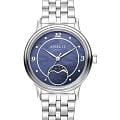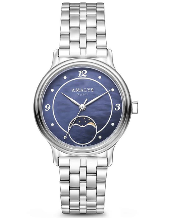 Amalys AMW-203 — женская модель с элегантным классическим стилем и утончёнными деталями. Круглый корпус изготовлен из нержавеющей стали и гармонирует с браслетом в том же исполнении, состоящим из звеньев и обеспечивающим комфортное прилегание к запястью. Защитную функцию выполняет сапфировое стеклоСапфировое стеклоПрочный и надёжный материал из кристалла сапфира синтетического происхождения, характеризующийся особой твёрдостью и устойчивостью к царапинам и повреждениям., которое отличается стойкостью к царапинам и сохраняет высокую прозрачность. В основе лежит кварцевый механизм, гарантирующий точность хода и простоту эксплуатации. Циферблат украшен изящными арабскими цифрами и метками, дополнен утончённым индикатором фаз Луны, который придаёт часам особый шарм и делает их акцентной деталью образа. Водозащита 3 ATM защищает от случайных брызг и дождя. Модель сочетает функциональность и изысканность, подойдёт как для повседневного стиля, так и для особых случаев.