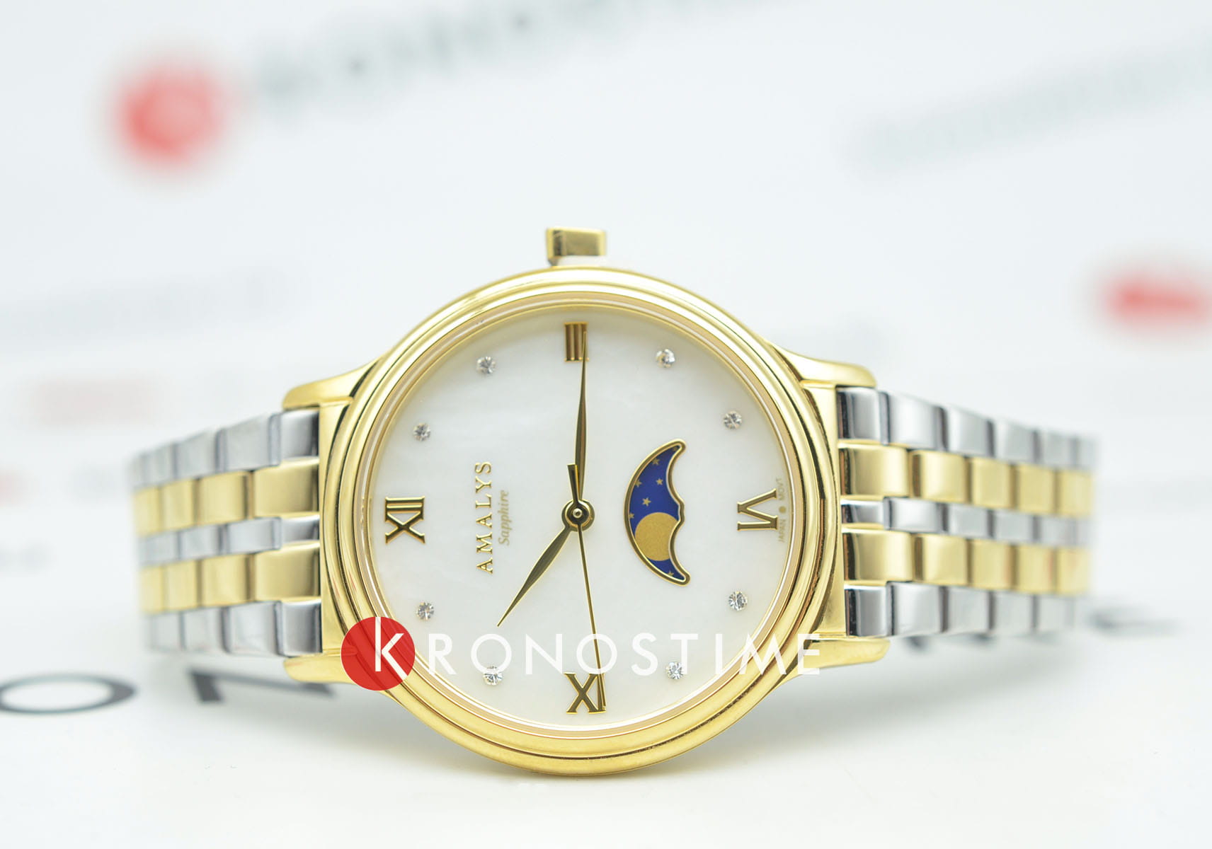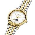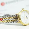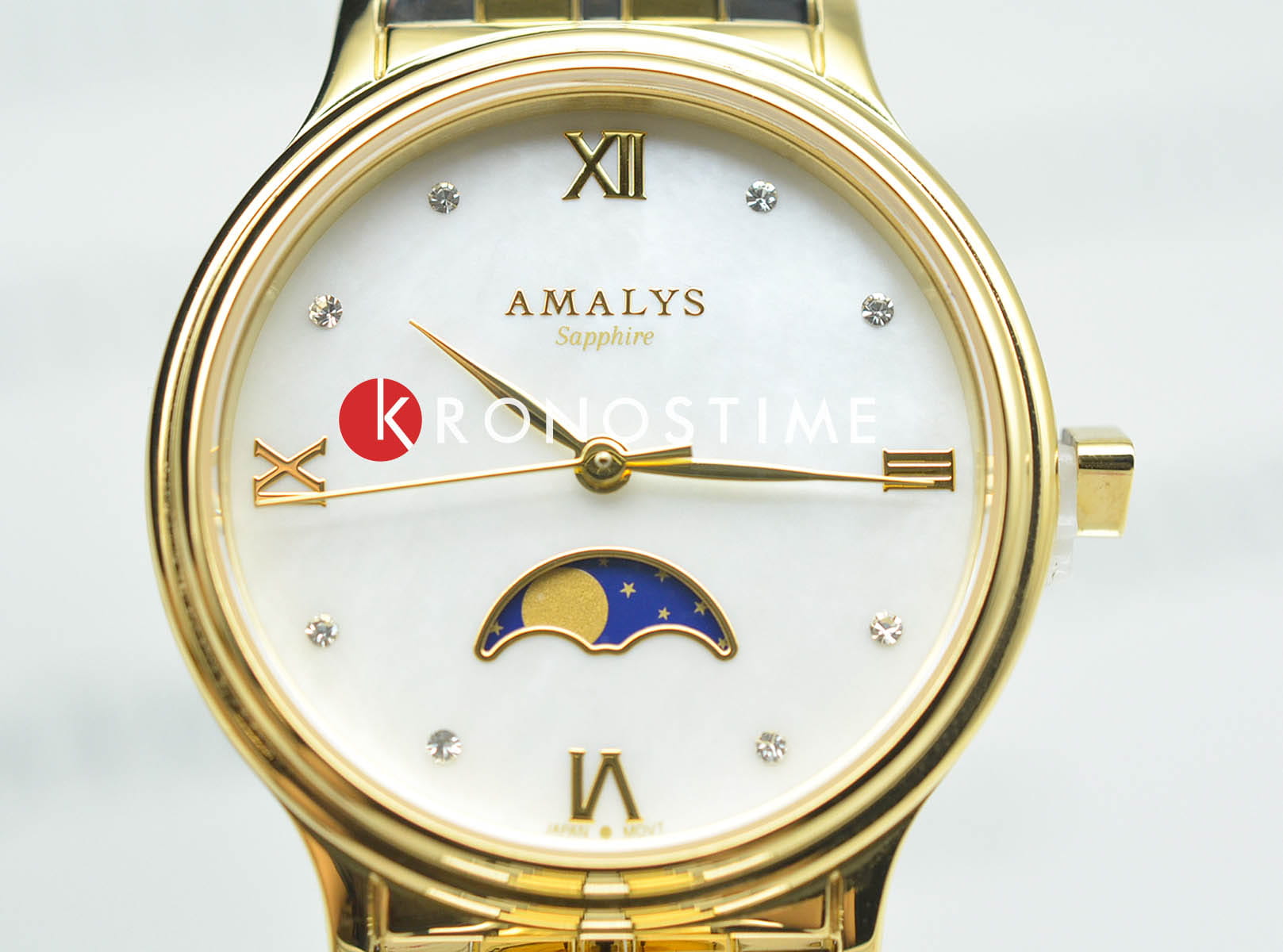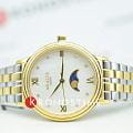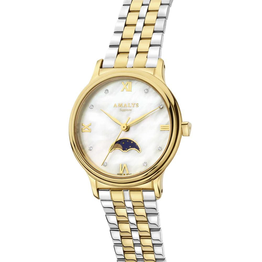 Amalys AMW-205 — женская модель с элегантным классическим стилем и утончёнными деталями. Круглый корпус изготовлен из нержавеющей стали с PVDPVDУльтратонкое покрытие наносится в технике вакуумного напыления, сочетает в себе нитрид титана особой прочности со слоем золота или оксида хрома. Несёт в себе декоративную или защитную функцию.-покрытием золотистого оттенка и гармонирует с браслетом в том же исполнении, состоящим из звеньев и обеспечивающим комфортное прилегание к запястью. Защитную функцию выполняет сапфировое стеклоСапфировое стеклоПрочный и надёжный материал из кристалла сапфира синтетического происхождения, характеризующийся особой твёрдостью и устойчивостью к царапинам и повреждениям., которое отличается стойкостью к царапинам и сохраняет высокую прозрачность. В основе лежит кварцевый механизм, гарантирующий точность хода и простоту эксплуатации. Циферблат украшен изящными римскими цифрами и метками, дополнен утончённым индикатором фаз Луны, который придаёт часам особый шарм и делает их акцентной деталью образа. Водозащита 3 ATM защищает от случайных брызг и дождя. Модель сочетает функциональность и изысканность, подойдёт как для повседневного стиля, так и для особых случаев.