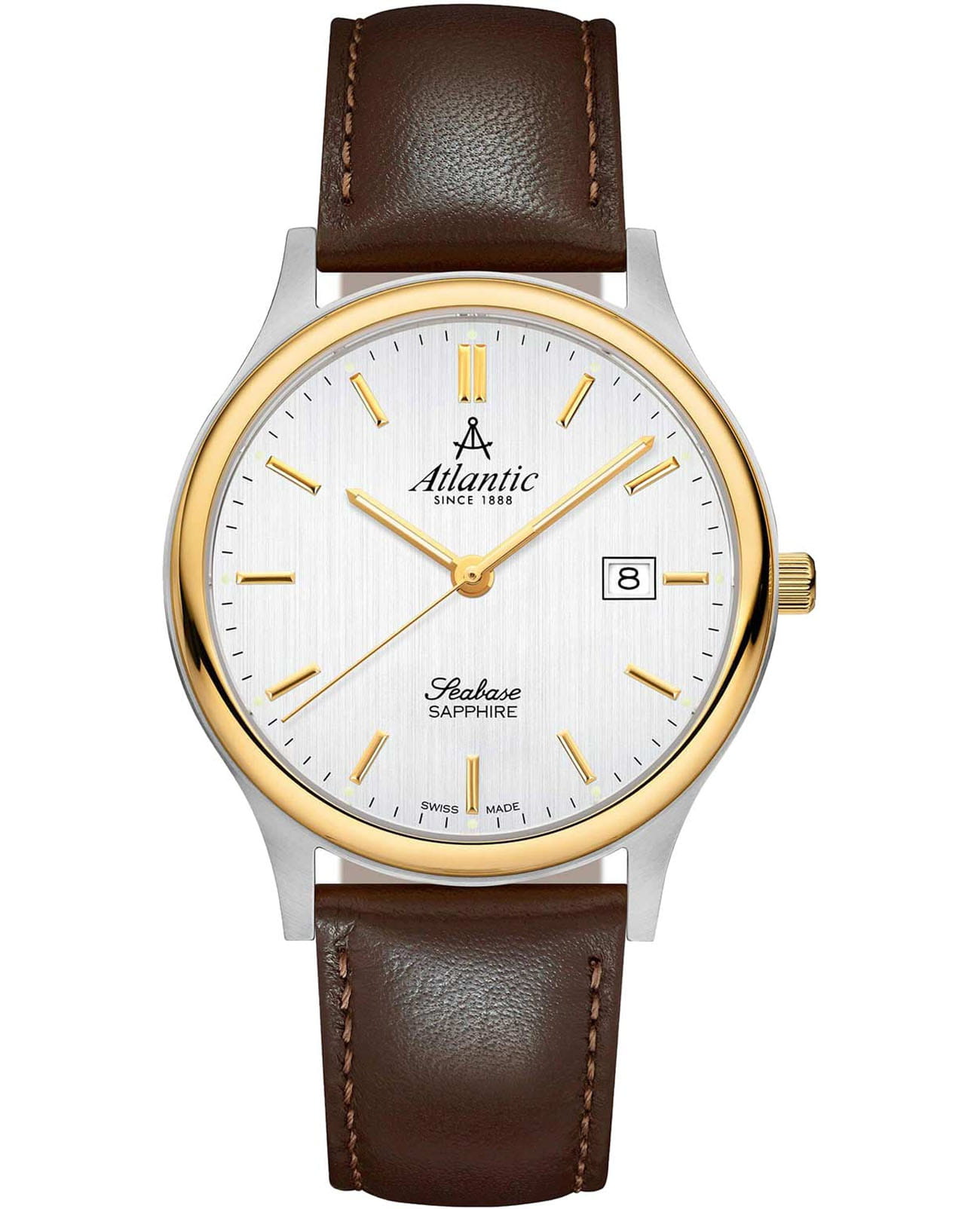Мужские кварцевые швейцарские часы Atlantic Seapair 60343.43.21, механизм с высокой точностью. Циферблат часов с сапфировым стекломСапфировое стеклоПрочный и надёжный материал из кристалла сапфира синтетического происхождения, характеризующийся особой твёрдостью и устойчивостью к царапинам и повреждениям., устойчивым к появлению царапин и обладающее высокой прозрачностью. Класс водозащиты: 30 метров, позволит защитить корпус от случайных брызг или капель дождя. Корпус часов изготовлен из нержавеющей стали.Кожаный ремешок на стандартной застёжке. Окошко даты находится в положении 3 часа. БезельБезельВнешний ободок, закрепляющий стекло. В спортивных часах так называется поворотное кольцо с делениями на циферблате, выполняет роль таймера – замеряет отрезки времени на шкале. Неподвижный безель – элемент декора. Однонаправленно вращающийся безель на дайверских часах позволяет фиксировать моменты погружения и выныривания на поверхность. с PVD-покрытиемPVDУльтратонкое покрытие наносится в технике вакуумного напыления, сочетает в себе нитрид титана особой прочности со слоем золота или оксида хрома. Несёт в себе декоративную или защитную функцию..