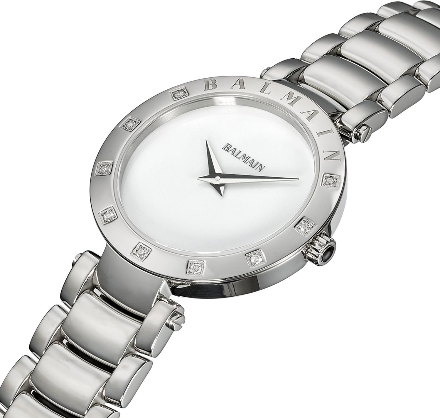 Женские часы Balmain Bijou B4255.33.25 кварцевый механизм с высокой точностью. Сапфировое стеклоСапфировое стеклоПрочный и надёжный материал из кристалла сапфира синтетического происхождения, характеризующийся особой твёрдостью и устойчивостью к царапинам и повреждениям. устойчивое к появлению царапин, обладающее высокой прозрачностью. Корпус изготовлен из нержавеющей стали. Класс водозащиты: 50 метров, позволит защитить корпус от случайных брызг или капель дождя. Стальной браслет на застёжке «бабочка» с кнопкамиЗастёжка "бабочка"Такой вид застёжки дополняется предохранителями, помогающими избежать случайного раскрытия браслета. Обладают изящным исполнением. .