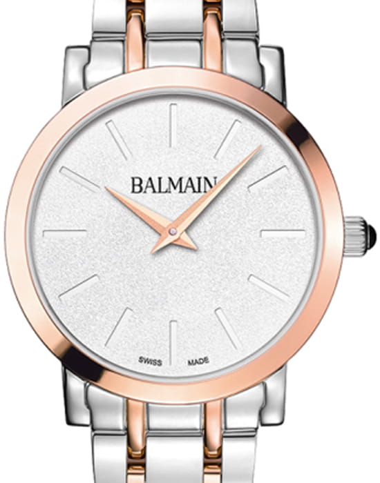 Женские часы Balmain Laelia B4438.33.26 кварцевый механизм с высокой точностью. Сапфировое стеклоСапфировое стеклоПрочный и надёжный материал из кристалла сапфира синтетического происхождения, характеризующийся особой твёрдостью и устойчивостью к царапинам и повреждениям. устойчивое к появлению царапин, обладающее высокой прозрачностью. Корпус изготовлен из нержавеющей стали PVD-покрытиемPVDУльтратонкое покрытие наносится в технике вакуумного напыления, сочетает в себе нитрид титана особой прочности со слоем золота или оксида хрома. Несёт в себе декоративную или защитную функцию.. Класс водозащиты: 50 метров, позволит защитить корпус от случайных брызг или капель дождя. Стальной браслет с PVD-покрытиемPVDУльтратонкое покрытие наносится в технике вакуумного напыления, сочетает в себе нитрид титана особой прочности со слоем золота или оксида хрома. Несёт в себе декоративную или защитную функцию.. на застёжке «бабочка» с кнопкамиЗастёжка "бабочка"Такой вид застёжки дополняется предохранителями, помогающими избежать случайного раскрытия браслета. Обладают изящным исполнением. . БезельБезельВнешний ободок, закрепляющий стекло. В спортивных часах так называется поворотное кольцо с делениями на циферблате, выполняет роль таймера – замеряет отрезки времени на шкале. Неподвижный безель – элемент декора. Однонаправленно вращающийся безель на дайверских часах позволяет фиксировать моменты погружения и выныривания на поверхность. с PVD-покрытиемPVDУльтратонкое покрытие наносится в технике вакуумного напыления, сочетает в себе нитрид титана особой прочности со слоем золота или оксида хрома. Несёт в себе декоративную или защитную функцию..
