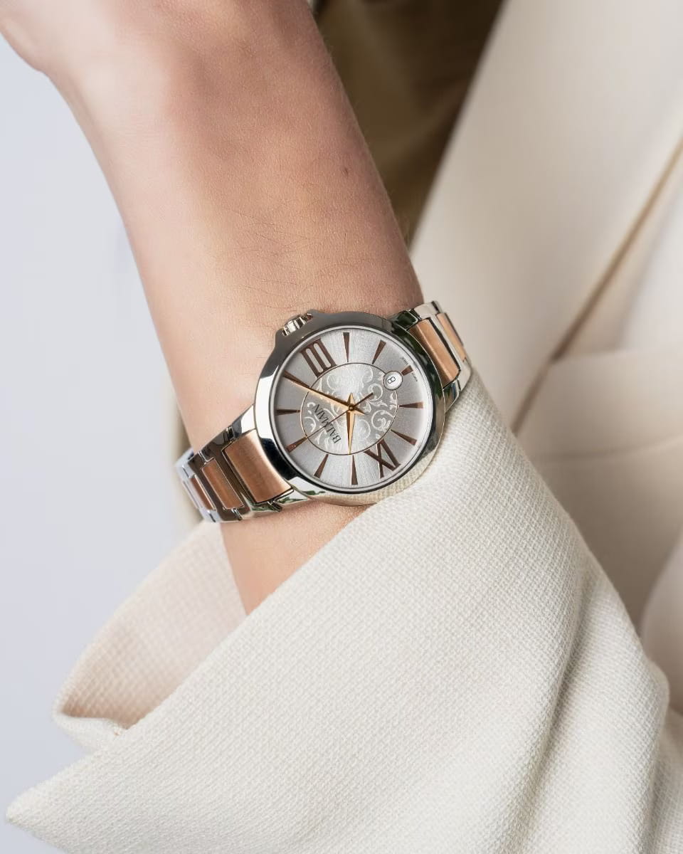 Женские часы Balmain Tilia B4571.38.12 кварцевый механизм с высокой точностью. Сапфировое стеклоСапфировое стеклоПрочный и надёжный материал из кристалла сапфира синтетического происхождения, характеризующийся особой твёрдостью и устойчивостью к царапинам и повреждениям. устойчивое к появлению царапин, обладающее высокой прозрачностью. Корпус изготовлен из нержавеющей стали. Класс водозащиты: 30 метров, позволит защитить корпус от случайных брызг или капель дождя. Стальной браслет с PVD-покрытиемPVDУльтратонкое покрытие наносится в технике вакуумного напыления, сочетает в себе нитрид титана особой прочности со слоем золота или оксида хрома. Несёт в себе декоративную или защитную функцию.. на застёжке «бабочка» с кнопкамиЗастёжка "бабочка"Такой вид застёжки дополняется предохранителями, помогающими избежать случайного раскрытия браслета. Обладают изящным исполнением. . Окошко даты находится в положении 6 часов.