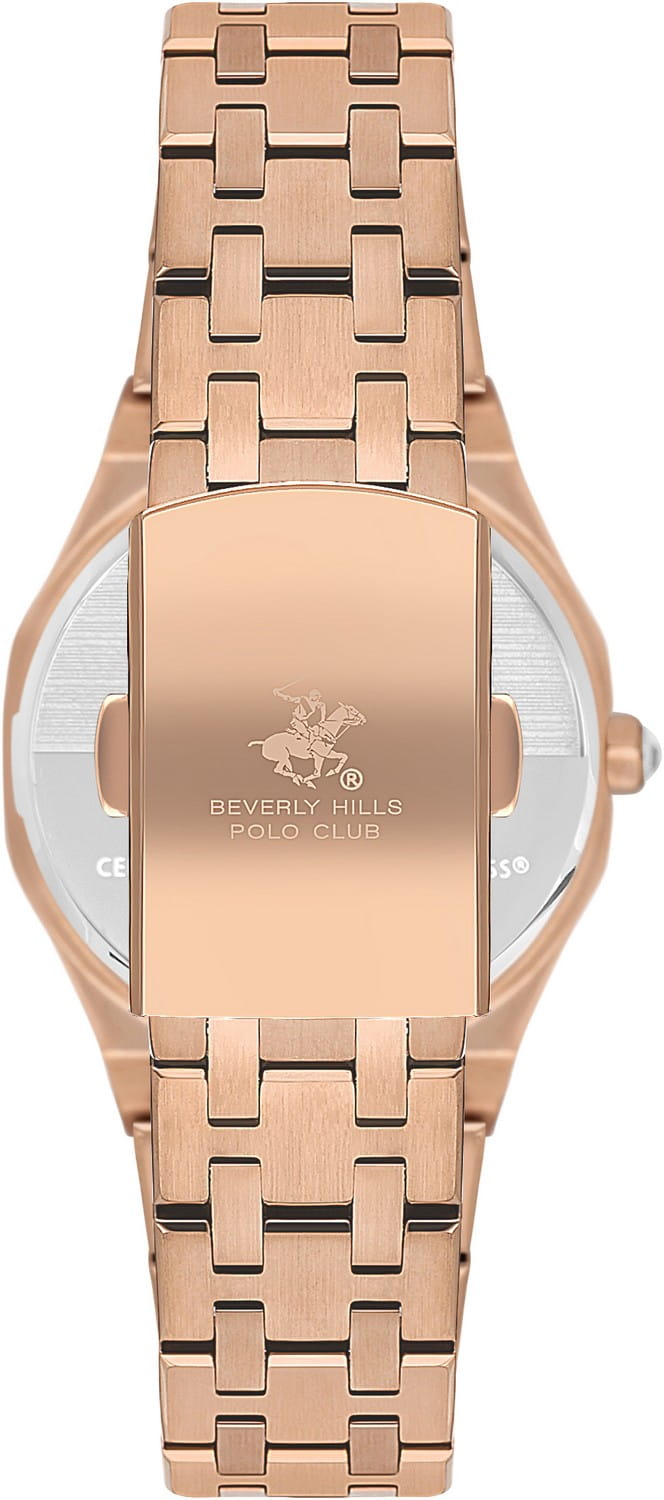 Женские наручные часы Beverly Hills Polo Club Quartz BP3631X.430 с надёжным кварцевым механизмом. Минеральное стеклоМинеральное стеклоМинеральное стекло представляет собой искусственно выращенный минерал кварца. Такое стекло отличается особой устойчивостью к повреждениям и царапинам. Уступает по некоторым качествам сапфировому стеклу. устойчивое к мелким механическим повреждениям. Корпус часов изготовлен из стали с IP-покрытиемIP-покрытиеМетод ионного напыления. Демонстрирует повышенную устойчивость к истиранию, окислению и химическим веществам. Под воздействием высокого давления и температуры около 1500°C молекулы металла надёжно соединяются с частицами корпуса часов.. Класс водозащиты: 50 метров, позволит защитить корпус от случайных брызг или капель дождя. Стальной браслет IP-покрытиемIP-покрытиеМетод ионного напыления. Демонстрирует повышенную устойчивость к истиранию, окислению и химическим веществам. Под воздействием высокого давления и температуры около 1500°C молекулы металла надёжно соединяются с частицами корпуса часов. на раскладной застёжкеРаскладная застёжкаТакой тип застёжки используется только на браслетах из металла. Она никогда не раскрывается полностью, происходит разделение на 2 и более частей. Раскладывающая застёжка снизит вероятность потери часов к минимуму..