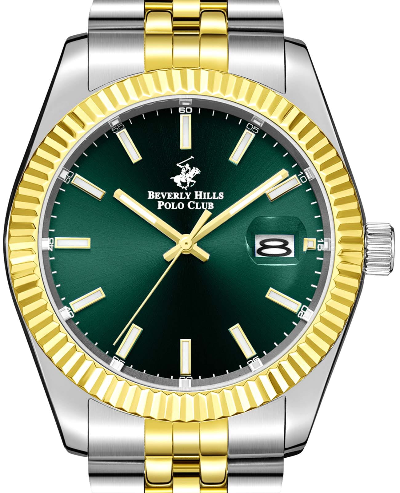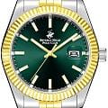 BEVERLY HILLS POLO CLUB BP3018X.271 — стильные мужские часы, сочетающие спортивную динамику и функциональность. Крупный корпус выполнен из нержавеющей стали диаметром 41 мм, гармонично дополнен стальным браслетом на застёжке-бабочке с кнопкамиЗастёжка "бабочка"Такой вид застёжки дополняется предохранителями, помогающими избежать случайного раскрытия браслета. Обладают изящным исполнением. с частичным IP-покрытиемIP-покрытиеМетод ионного напыления. Демонстрирует повышенную устойчивость к истиранию, окислению и химическим веществам. Под воздействием высокого давления и температуры около 1500°C молекулы металла надёжно соединяются с частицами корпуса часов.. Рифленый неподвижный безельБезельВнешний ободок, закрепляющий стекло. В спортивных часах так называется поворотное кольцо с делениями на циферблате, выполняет роль таймера – замеряет отрезки времени на шкале. Неподвижный безель – элемент декора. Однонаправленно вращающийся безель на дайверских часах позволяет фиксировать моменты погружения и выныривания на поверхность. с IP-покрытиемIP-покрытиеМетод ионного напыления. Демонстрирует повышенную устойчивость к истиранию, окислению и химическим веществам. Под воздействием высокого давления и температуры около 1500°C молекулы металла надёжно соединяются с частицами корпуса часов. золотистого цвета. Циферблат с акцентными метками и стрелками с люминесцентным покрытиемЛюминесцентное покрытиеПозволяет считывать показания времени в темноте. Производители наносят на стрелки, часовые индексы, безель или поверхность циферблата светонакопительный состав, дающий холодное свечение. делает модель более практичной. Минеральное стеклоМинеральное стеклоМинеральное стекло представляет собой искусственно выращенный минерал кварца. Такое стекло отличается особой устойчивостью к повреждениям и царапинам. Уступает по некоторым качествам сапфировому стеклу. с сапфировым покрытием защищает циферблат от царапин, а кварцевый механизм обеспечивает высокую точность. Окошко даты находится в положении 3 часа. Благодаря своей универсальной эстетике эти часы уместны и в деловой среде, и в повседневном образе. Идеальный выбор для тех, кто ценит элегантный дизайн и качество.