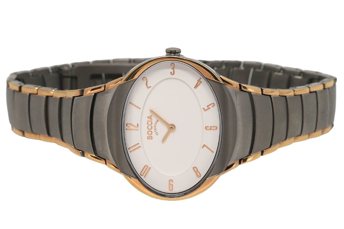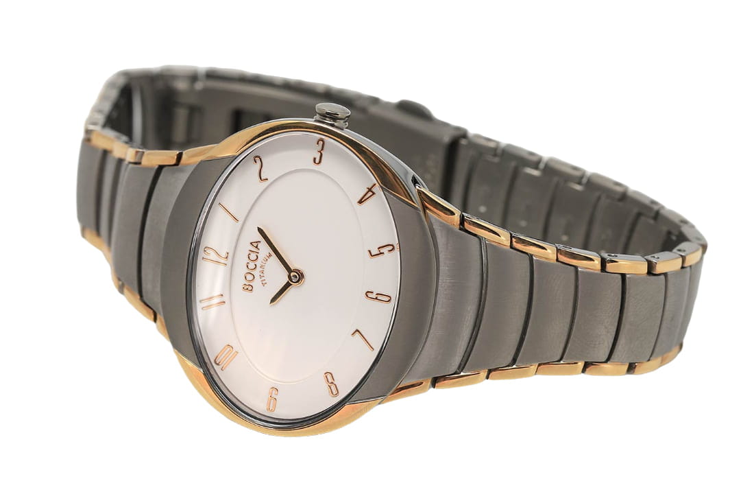 Женские немецкие титановые часы Boccia Titanium 3165-12, кварцевый механизм с высокой точностью. Класс водозащиты: 50 метров, позволит защитить корпус от случайных брызг или капель дождя. Корпус часов изготовлен из титана, цвета.