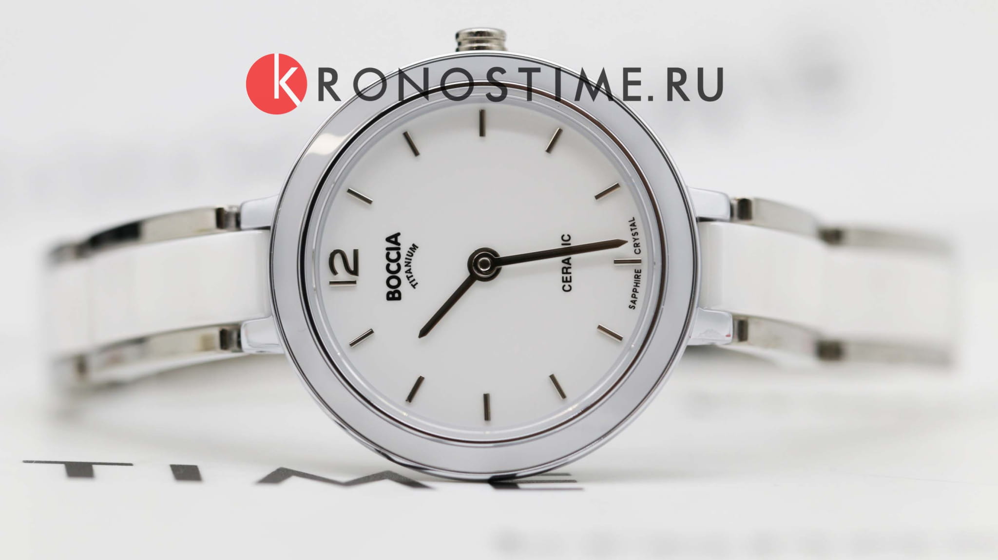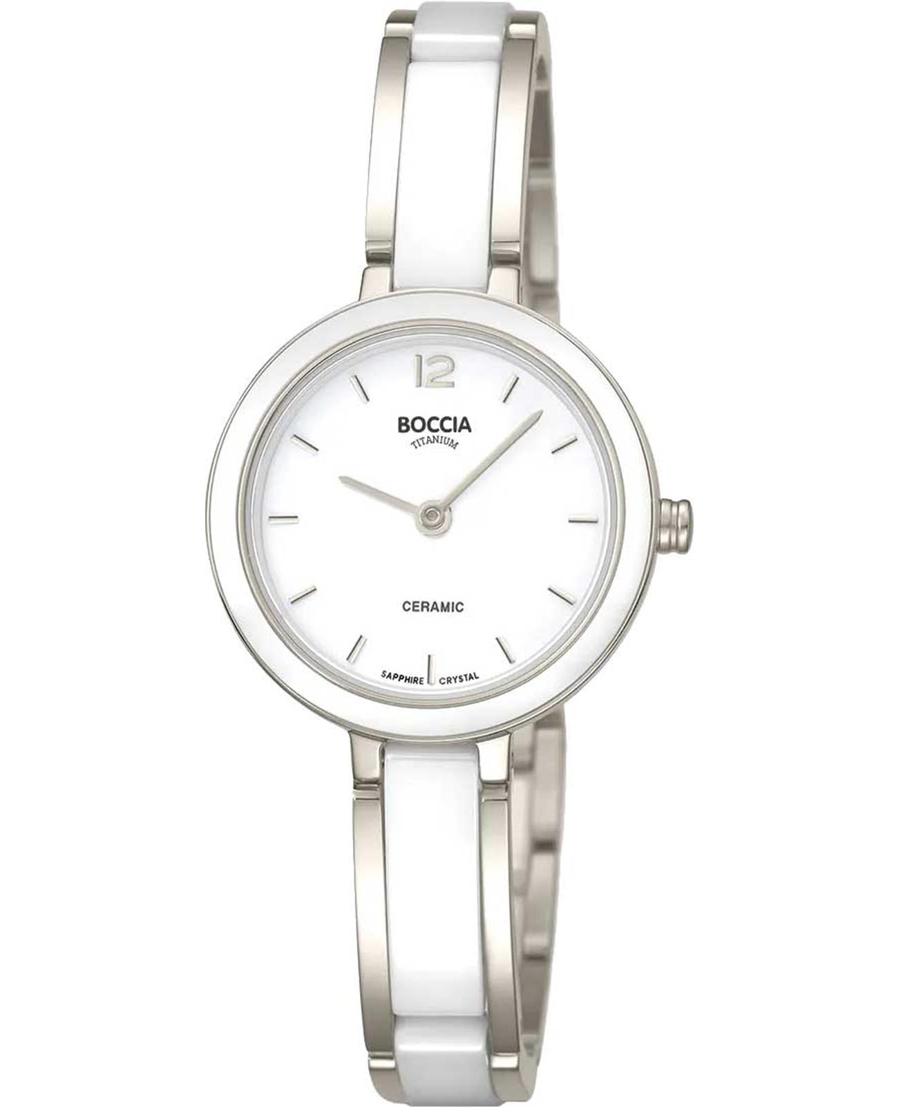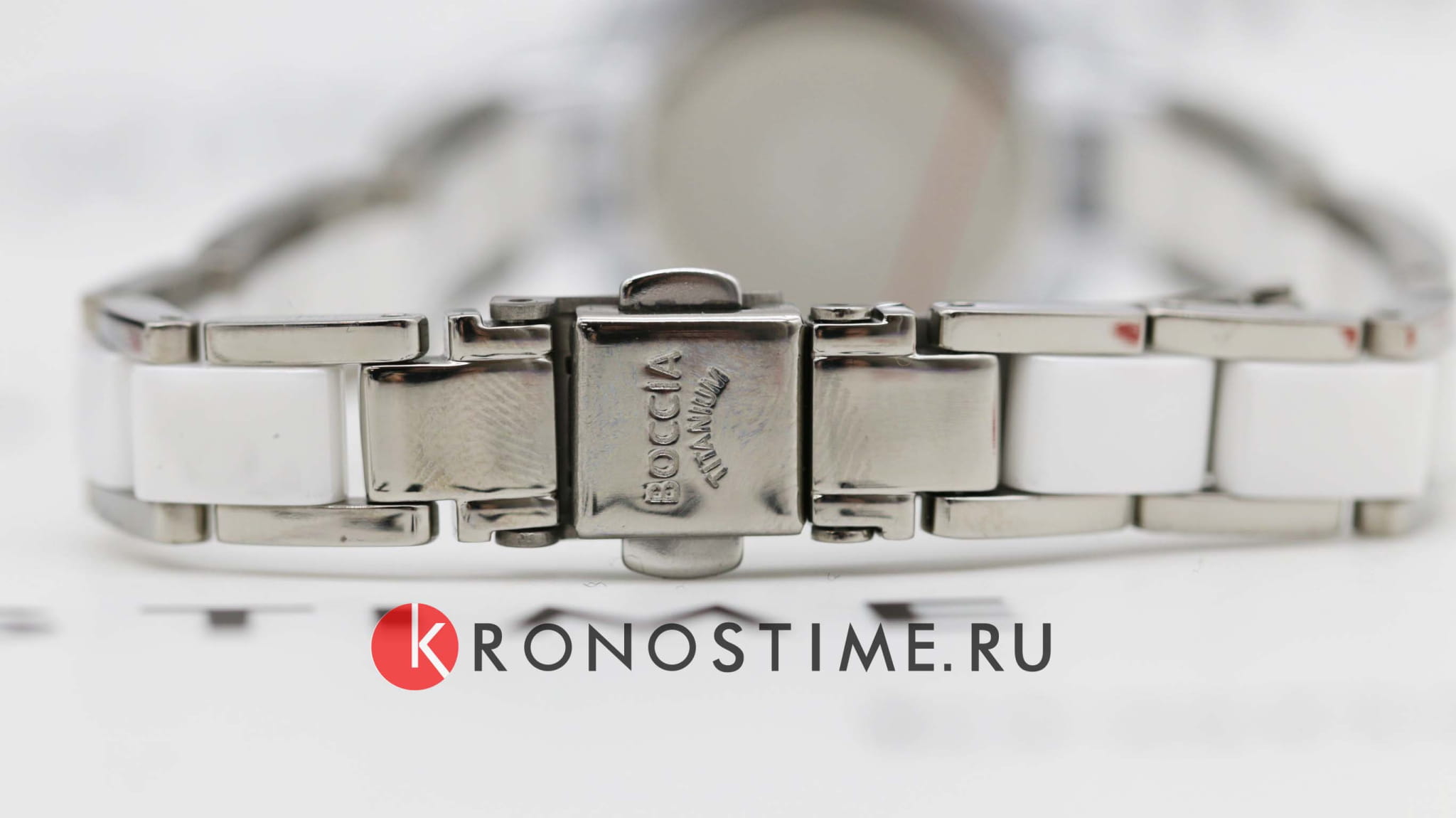 Женские наручные часы Boccia Titanium 3333-01 с надёжным кварцевым механизмом. Корпус и браслет часов изготовлены из титана с керамическими вставками. Сапфировое стеклоСапфировое стеклоПрочный и надёжный материал из кристалла сапфира синтетического происхождения, характеризующийся особой твёрдостью и устойчивостью к царапинам и повреждениям. устойчивое к мелким механическим повреждениям. Класс водозащиты: 50 метров, позволит защитить корпус от случайных брызг или капель дождя. Титановый браслет на раскладной застёжкеРаскладная застёжкаТакой тип застёжки используется только на браслетах из металла. Она никогда не раскрывается полностью, происходит разделение на 2 и более частей. Раскладывающая застёжка снизит вероятность потери часов к минимуму..