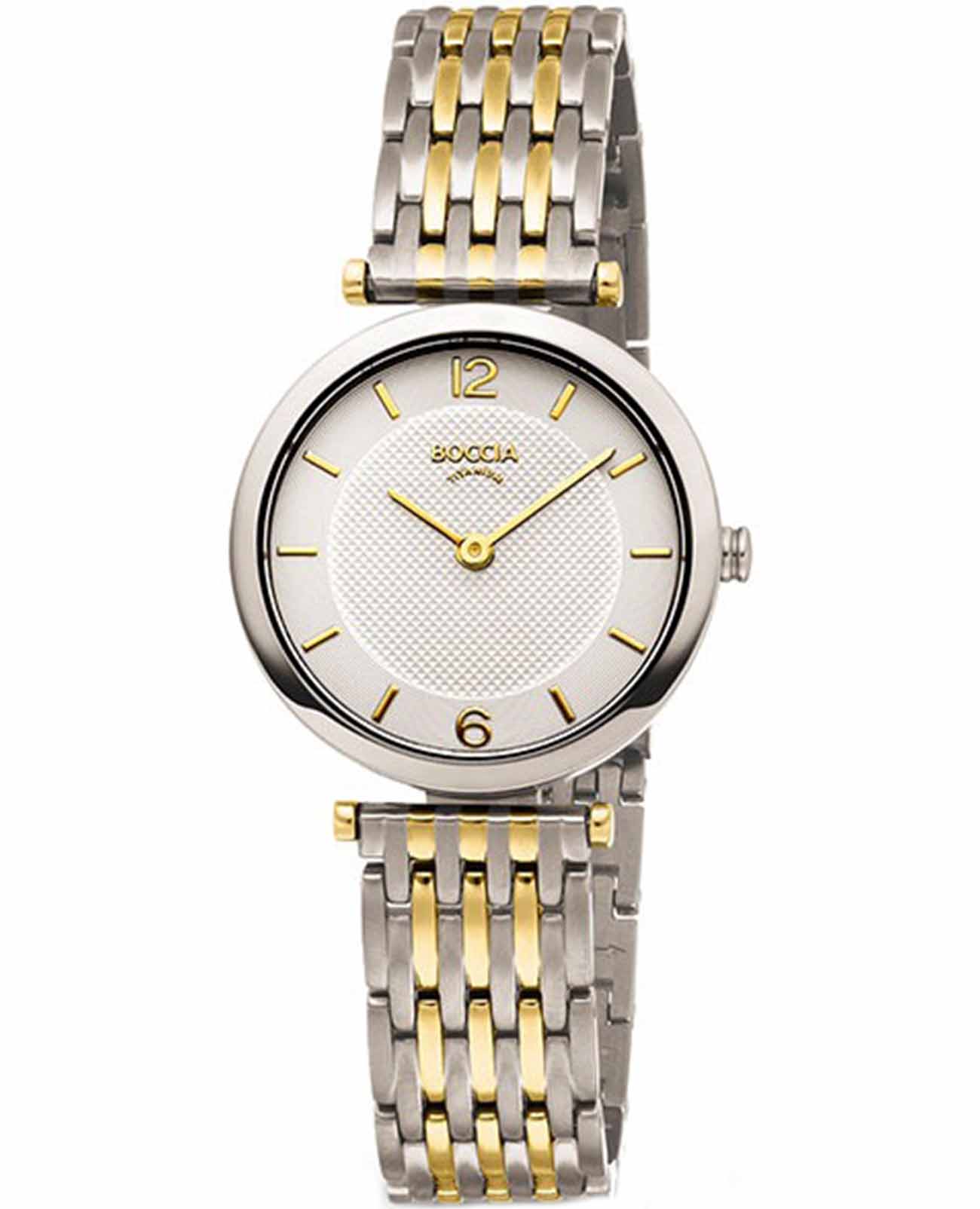 Часы Boccia 3362-03 — это утонченный аксессуар для женщин, сочетающий в себе элегантность и надежность. Эти кварцевые часы оснащены механизмом Miyota GL22, который обеспечивает точность хода. Серебристый циферблат придает модели классическую изысканность, гармонично сочетаясь с круглым корпусом из гипоаллергенного титана. Диаметр корпуса составляет 30 мм, что делает часы аккуратными и элегантными, идеально подходящими для женской руки. Стальной браслет с частичным PVDPVDУльтратонкое покрытие наносится в технике вакуумного напыления, сочетает в себе нитрид титана особой прочности со слоем золота или оксида хрома. Несёт в себе декоративную или защитную функцию. покрытием цвета желтого золота с раскладной застёжкойРаскладная застёжкаТакой тип застёжки используется только на браслетах из металла. Она никогда не раскрывается полностью, происходит разделение на 2 и более частей. Раскладывающая застёжка снизит вероятность потери часов к минимуму. добавляет комфорта и завершает стильный образ. Часы защищены прочным минеральным стекломМинеральное стеклоМинеральное стекло представляет собой искусственно выращенный минерал кварца. Такое стекло отличается особой устойчивостью к повреждениям и царапинам. Уступает по некоторым качествам сапфировому стеклу., устойчивым к мелким механическим повреждениям, что обеспечивает их долговечность и сохранение презентабельного вида. Водостойкость на уровне WR 50 позволяет не беспокоиться о попадании воды при мытье рук или в дождливую погоду. долговечность.