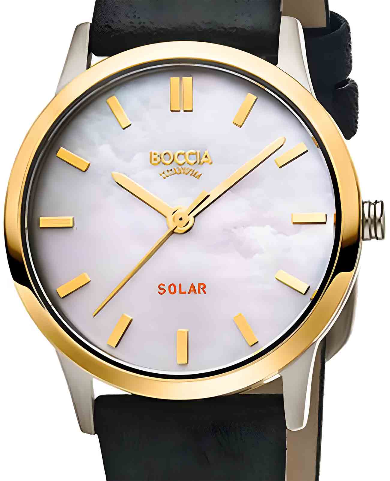 Женские наручные часы Boccia 3363-02 — это утонченный аксессуар, сочетающий в себе элегантность и надежность. Эти кварцевые часы оснащены солнечной батареей. Белый перламутровый циферблат придает модели классическую изысканность, гармонично сочетаясь с круглым корпусом из гипоаллергенного титана. Диаметр корпуса составляет 30 мм, что делает часы аккуратными и элегантными, идеально подходящими для женской руки. Черный кожаный ремешок с классической застежкой добавляет комфорта и завершает стильный образ. Часы защищены прочным минеральным стекломМинеральное стеклоМинеральное стекло представляет собой искусственно выращенный минерал кварца. Такое стекло отличается особой устойчивостью к повреждениям и царапинам. Уступает по некоторым качествам сапфировому стеклу., устойчивым к мелким механическим повреждениям, что обеспечивает их долговечность и сохранение презентабельного вида. БезельБезельВнешний ободок, закрепляющий стекло. В спортивных часах так называется поворотное кольцо с делениями на циферблате, выполняет роль таймера – замеряет отрезки времени на шкале. Неподвижный безель – элемент декора. Однонаправленно вращающийся безель на дайверских часах позволяет фиксировать моменты погружения и выныривания на поверхность. с PVDPVDУльтратонкое покрытие наносится в технике вакуумного напыления, сочетает в себе нитрид титана особой прочности со слоем золота или оксида хрома. Несёт в себе декоративную или защитную функцию. покрытием цвета желтого золота. Водостойкость на уровне WR 50 позволяет не беспокоиться о попадании воды при мытье рук или в дождливую погоду.