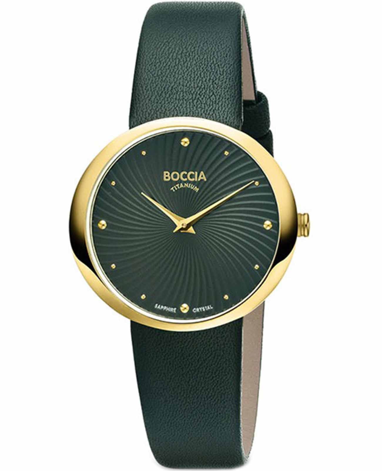 Женские часы Boccia Titanium 3364-04 станут прекрасным дополнением вашего стильного образа. Эти часы оснащены надежным кварцевым механизмом Miyota GL22, обеспечивающим точное время. Центральные часовая и минутная стрелки аккуратно выделяются на зеленом гильошированном циферблате, придавая часам элегантный вид. Корпус часов выполнен из суперлегкого титана с PVDPVDУльтратонкое покрытие наносится в технике вакуумного напыления, сочетает в себе нитрид титана особой прочности со слоем золота или оксида хрома. Несёт в себе декоративную или защитную функцию.-покрытием цвета желтого золота, что делает их не только прочными, но и невероятно комфортными в ношении. Овальная форма корпуса размером 30 х 32 мм добавляет изысканности и утонченности. Зеленый кожаный ремешок с классической застежкой гармонично дополняет общий стиль часов. Сапфировое стеклоСапфировое стеклоПрочный и надёжный материал из кристалла сапфира синтетического происхождения, характеризующийся особой твёрдостью и устойчивостью к царапинам и повреждениям., устойчивое к появлению царапин, надежно защищает циферблат, обеспечивая долговечность и сохранение первоначального внешнего вида. Водостойкость уровня WR 50 позволяет не беспокоиться о попадании влаги при мытье рук или в дождливую погоду.