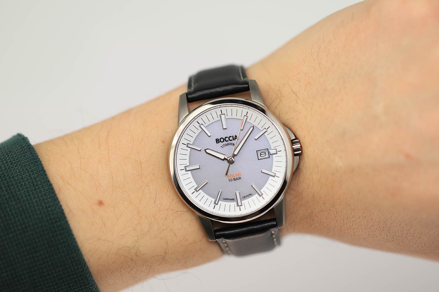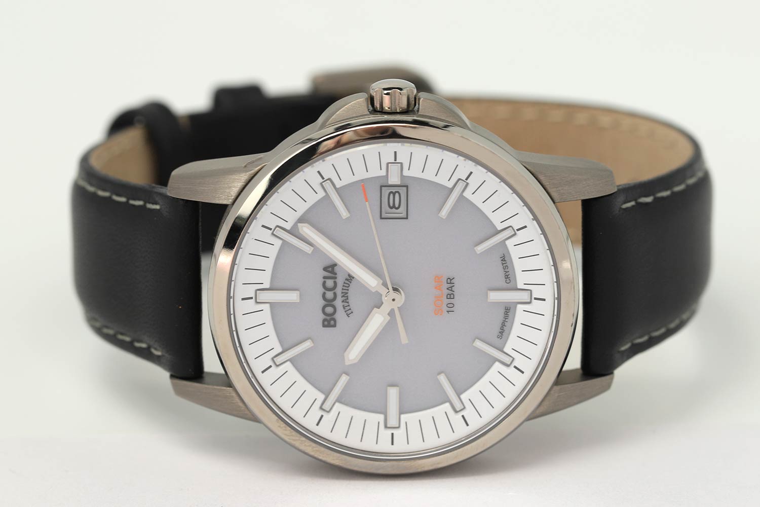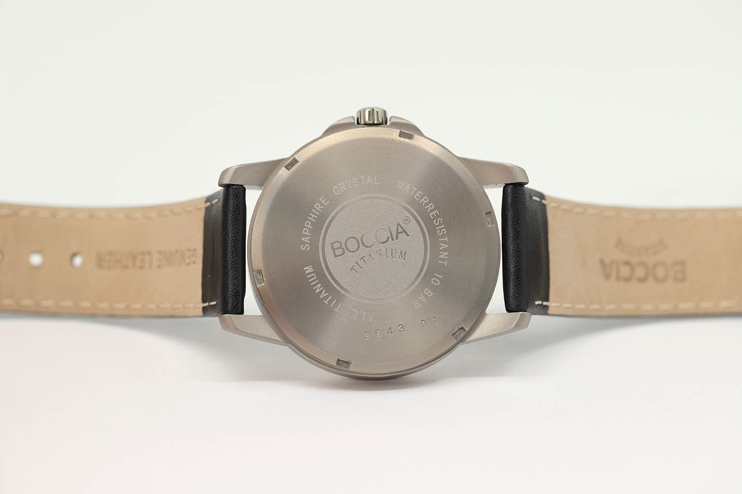 Мужские наручные часы Boccia Titanium 3643-01 с надёжным кварцевым механизмом. Питание от солнечной энергии. Корпус часов изготовлен из титана. Сапфировое стеклоСапфировое стеклоПрочный и надёжный материал из кристалла сапфира синтетического происхождения, характеризующийся особой твёрдостью и устойчивостью к царапинам и повреждениям. устойчивое к мелким механическим повреждениям. Класс водозащиты: 100 метров, позволит плавать, нырять и заниматься другими водными видами спорта. Окошко даты в положении 3 часа. Кожаный ремешок на стандартной застёжке. Стрелки и метки с люминесцентным покрытиемЛюминесцентное покрытиеПозволяет считывать показания времени в темноте. Производители наносят на стрелки, часовые индексы, безель или поверхность циферблата светонакопительный состав, дающий холодное свечение..