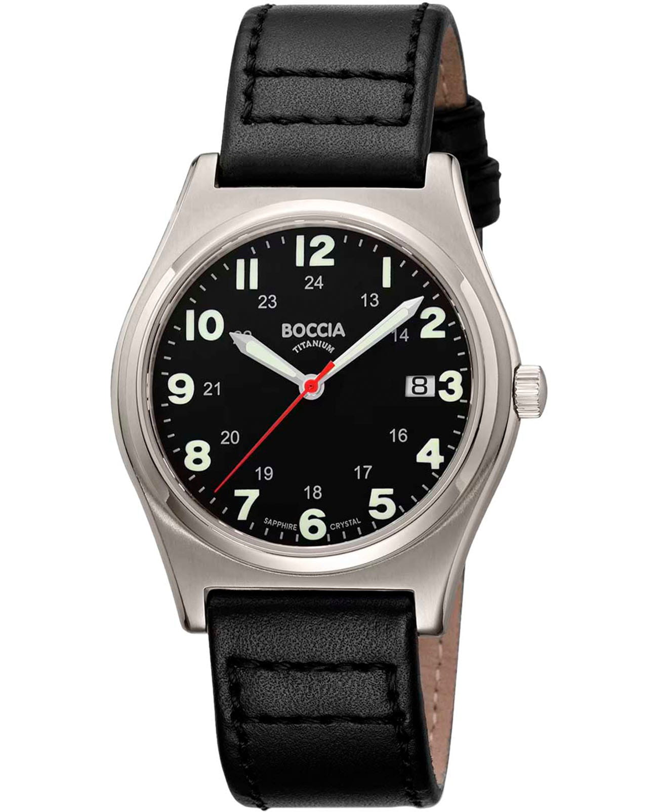 Мужские кварцевые часы Boccia Titanium 3674-01 практичная классика с немецким качеством и повышенной функциональностью. Круглый корпус диаметром 39 мм выполнен из гипоаллергенного титана, сочетая лёгкость и прочность. Чёрный циферблат с арабскими цифрами поддерживает двойной формат времени: 12- и 24-часовой, что особенно удобно для делового или путешествующего мужчины. Окошко даты расположено в положении 3 часа. Стекло сапфировоеСапфировое стеклоПрочный и надёжный материал из кристалла сапфира синтетического происхождения, характеризующийся особой твёрдостью и устойчивостью к царапинам и повреждениям., устойчивое к царапинам. Стрелки и метки оснащены люминесцентным покрытием для отличной видимости в темноте. Заводная головка рифлёная, обеспечивает надёжное управление. Водонепроницаемость 50 м подходит для повседневного ношения, включая дождь и контакт с водой при умывании. Кожаный ремешок на стандартной застёжке. Идеальный выбор для тех, кто ценит немецкое мастерство, чёткость отсчёта времени, лёгкий титановый корпус и универсальный стиль под любой образ.