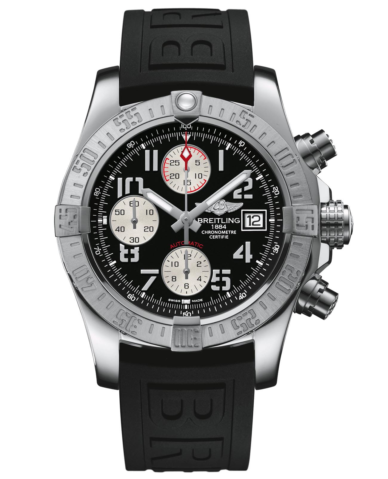 Хронограф Avenger II – воплощение силы и решимости. Прекрасно различимые цифры в трафаретном начертании и часовые маркеры – отличительная особенность этих часов. Стальной корпус с водонепроницаемостью 300 м (1000 футов) оснащен завинчивающимися кнопками с накладками. Внутри него находится механизм хронографа с автоподзаводом, прошедший, как и все калибры Breitling, официальную сертификацию. На заднюю крышку из титана нанесена шкала конвертации единиц измерения английской системы мер в метрические. Образец надежных и функциональных часов с превосходной эргономикой.