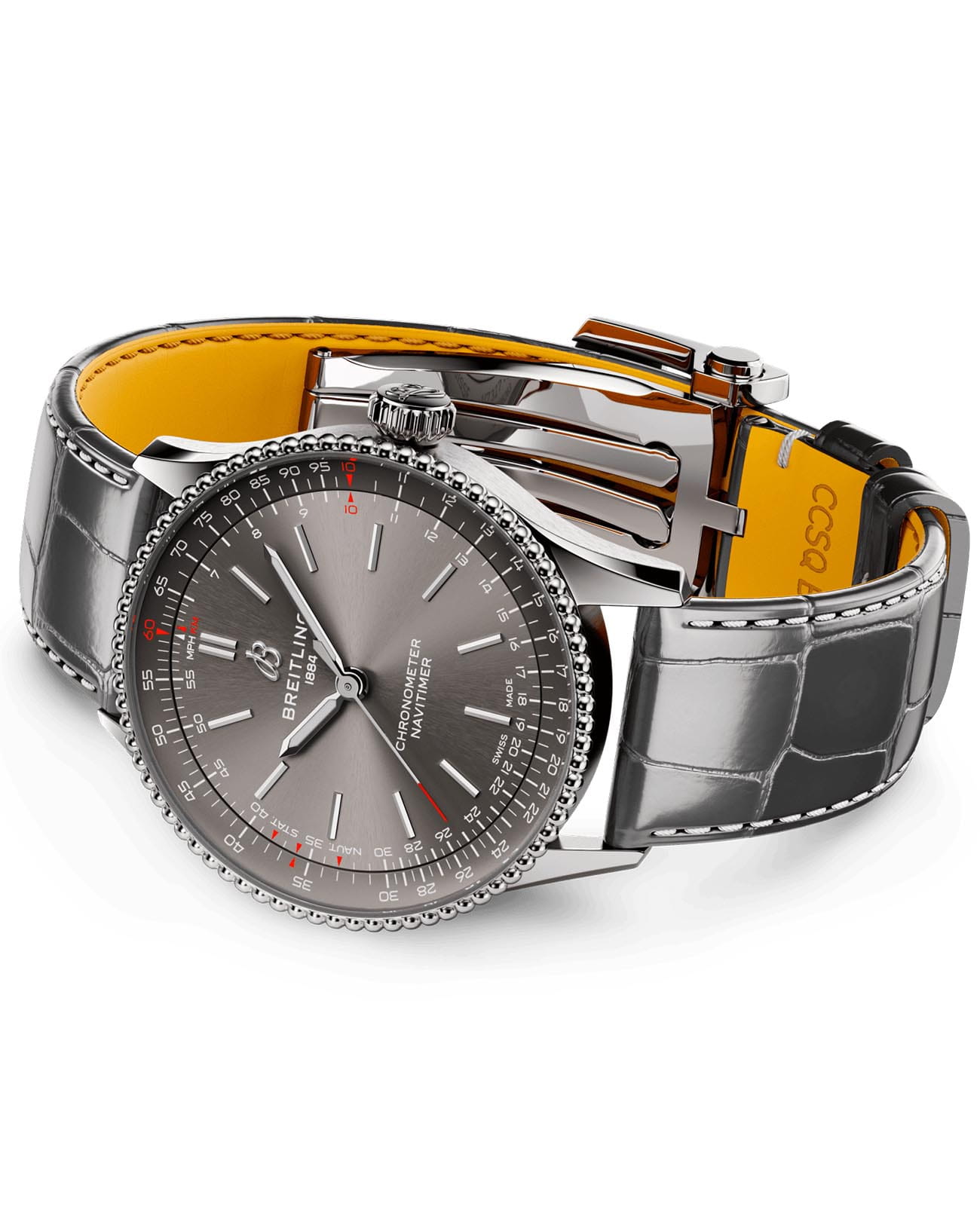 Швейцарские унисекс часы-хронометр Breitling Navitimer Automatic 36 A17327381B1P1, механический механизм (автоматический калибр) с высокой точностью. Сапфировое стеклоСапфировое стеклоПрочный и надёжный материал из кристалла сапфира синтетического происхождения, характеризующийся особой твёрдостью и устойчивостью к царапинам и повреждениям. устойчивое к появлению царапин, обладающее высокой прозрачностью. Класс водозащиты: 30 метров, позволит защитить корпус от случайных брызг или капель дождя. Корпус часов изготовлен из нержавеющей стали. Ремешок из кожи аллигатора с раскладной застёжкойРаскладная застёжкаТакой тип застёжки используется только на браслетах из металла. Она никогда не раскрывается полностью, происходит разделение на 2 и более частей. Раскладывающая застёжка снизит вероятность потери часов к минимуму.. Часы оснащены логарифмической линейкой. Стрелки с люминесцентным покрытиемЛюминесцентное покрытиеПозволяет считывать показания времени в темноте. Производители наносят на стрелки, часовые индексы, безель или поверхность циферблата светонакопительный состав, дающий холодное свечение..