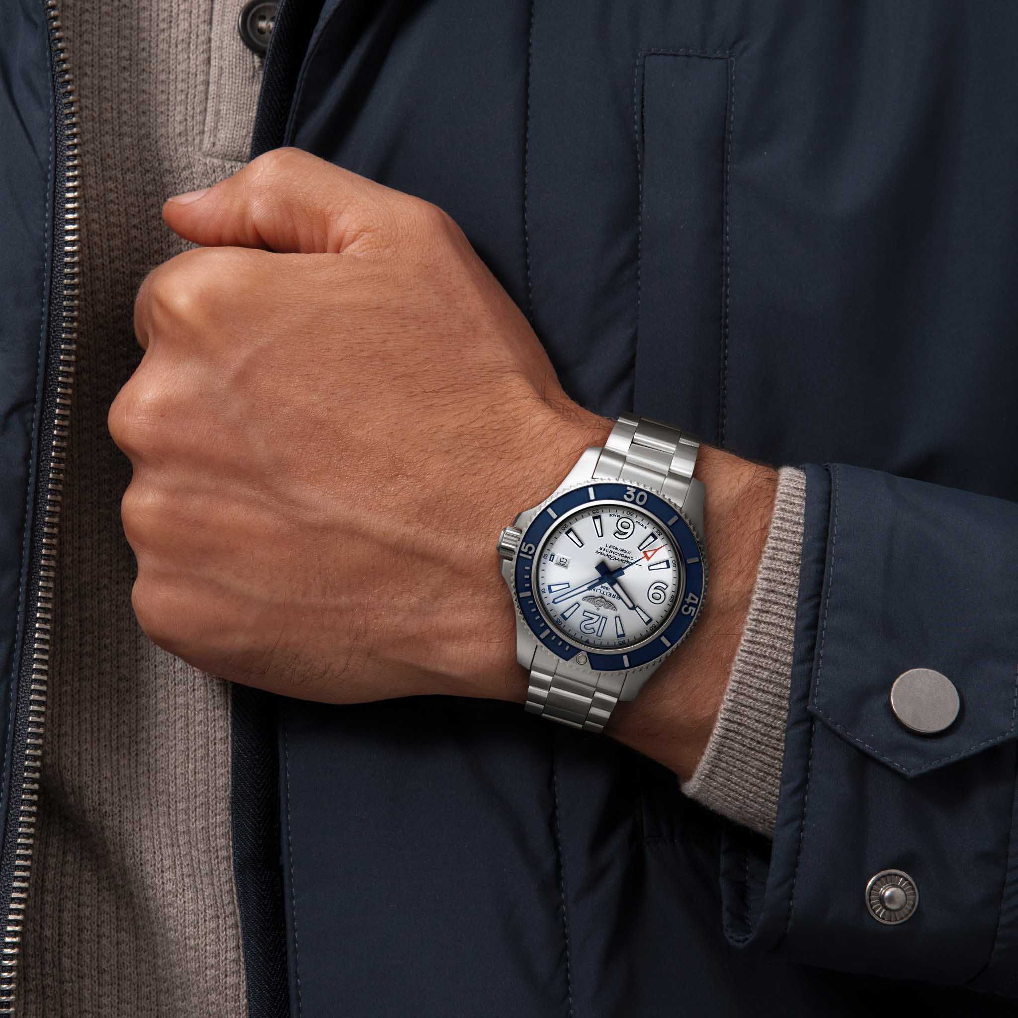 Современная, спортивная и яркая модель Superocean Automatic 42 совмещает в себе прекрасные технические характеристики с современным дизайном – она изящно выглядит на любом запястье. Эти часы не боятся ничего: в них можно погружаться под воду, заниматься серфингом или делать заплывы!