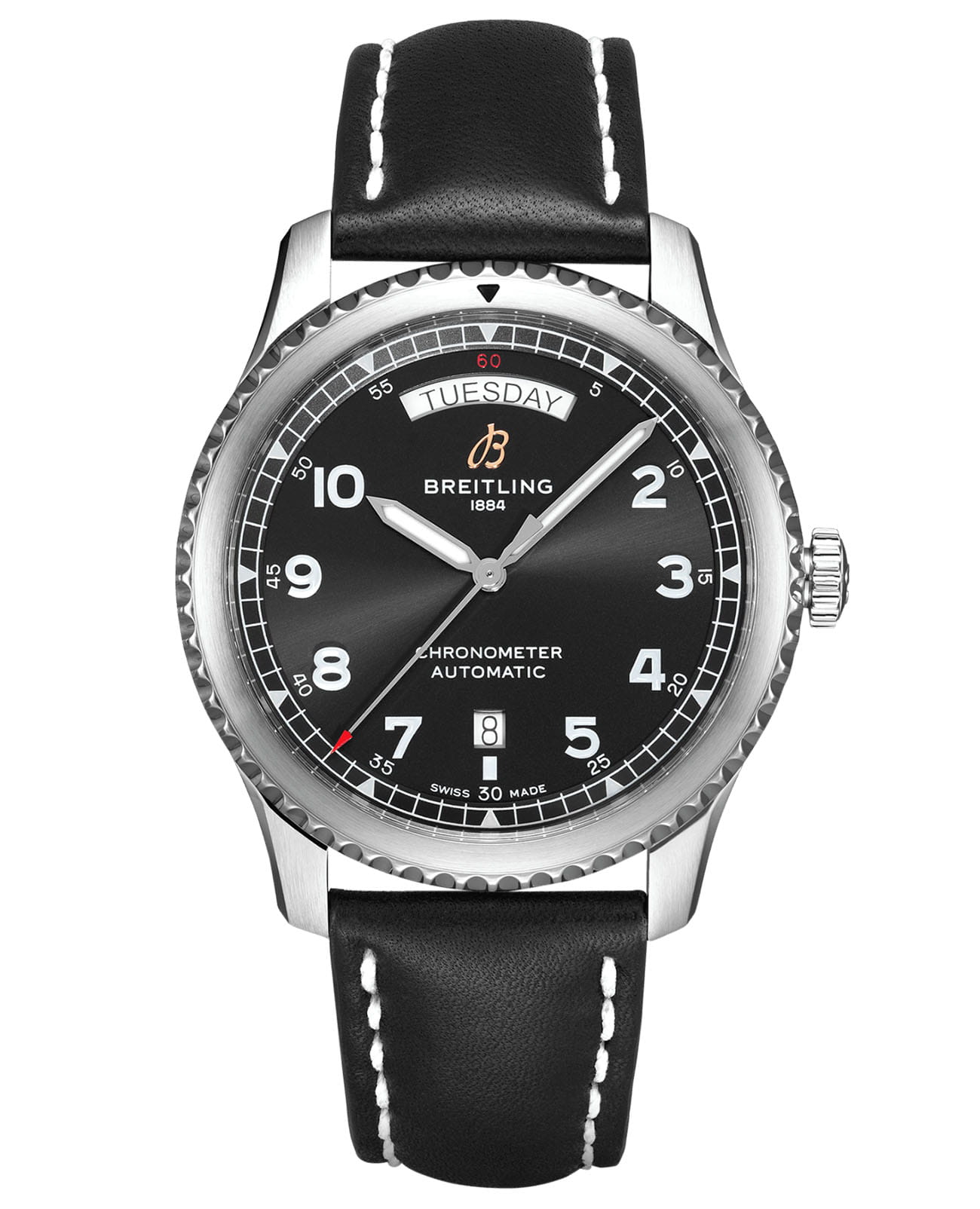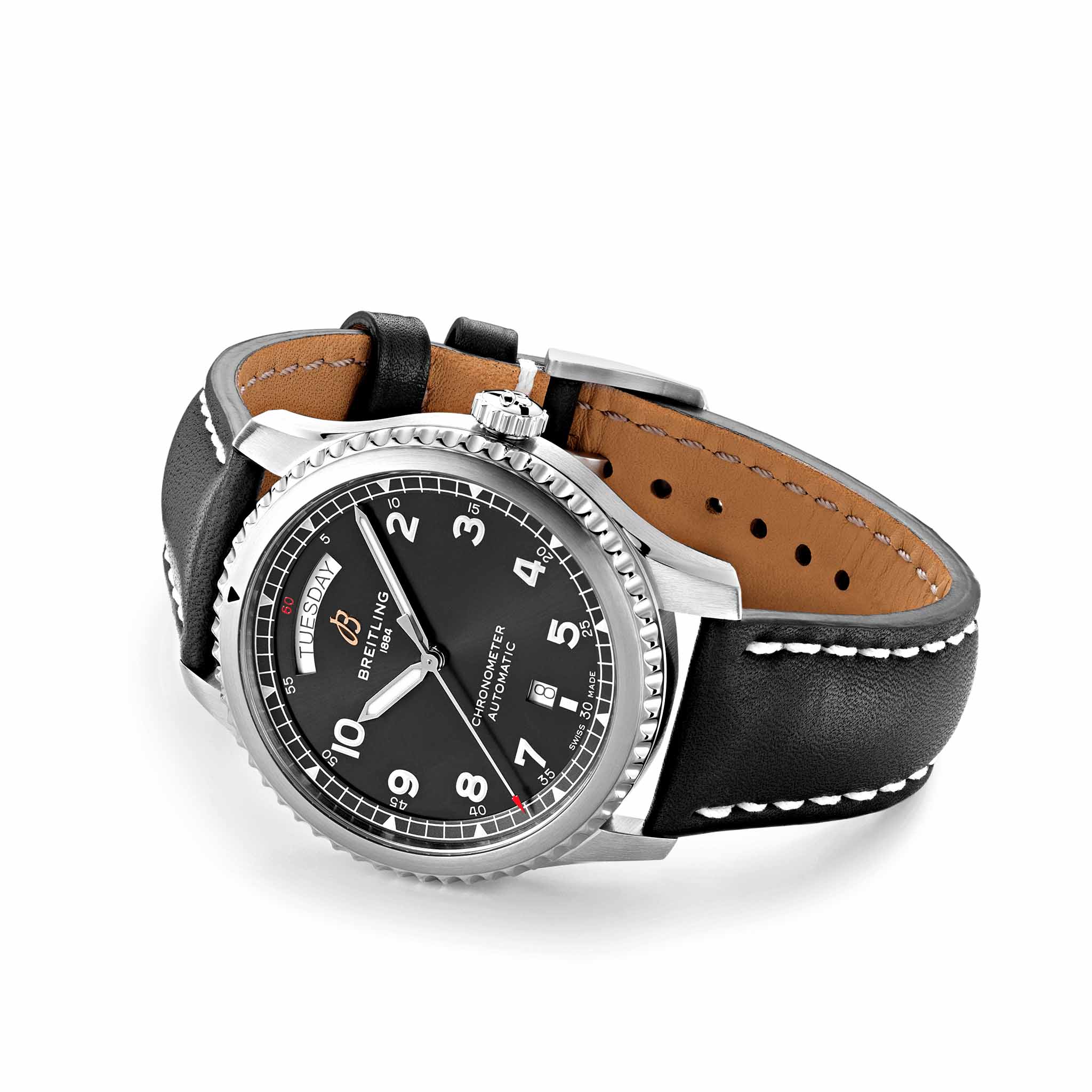 На дисплее Aviator 8 Day & Date 41 на видном месте отображаются день недели и дата, а также время. День недели указан в положении "12 часов", в то время как дата идеально расположена в положении "6 часов". Эти автоматические наручные часы Breitling калибра 45 оснащены двунаправленным роторным заводом с запасом хода более 40 часов. Циферблат черного или синего цвета виден через двойное сапфировое стеклоСапфировое стеклоПрочный и надёжный материал из кристалла сапфира синтетического происхождения, характеризующийся особой твёрдостью и устойчивостью к царапинам и повреждениям. с антибликовым покрытием. Стальной корпус диаметром 41 мм имеет прочную завинчивающуюся заднюю крышку. Вращающийся в две стороны безельБезельВнешний ободок, закрепляющий стекло. В спортивных часах так называется поворотное кольцо с делениями на циферблате, выполняет роль таймера – замеряет отрезки времени на шкале. Неподвижный безель – элемент декора. Однонаправленно вращающийся безель на дайверских часах позволяет фиксировать моменты погружения и выныривания на поверхность.. Он поставляется со стальным браслетом или кожаным ремешком.