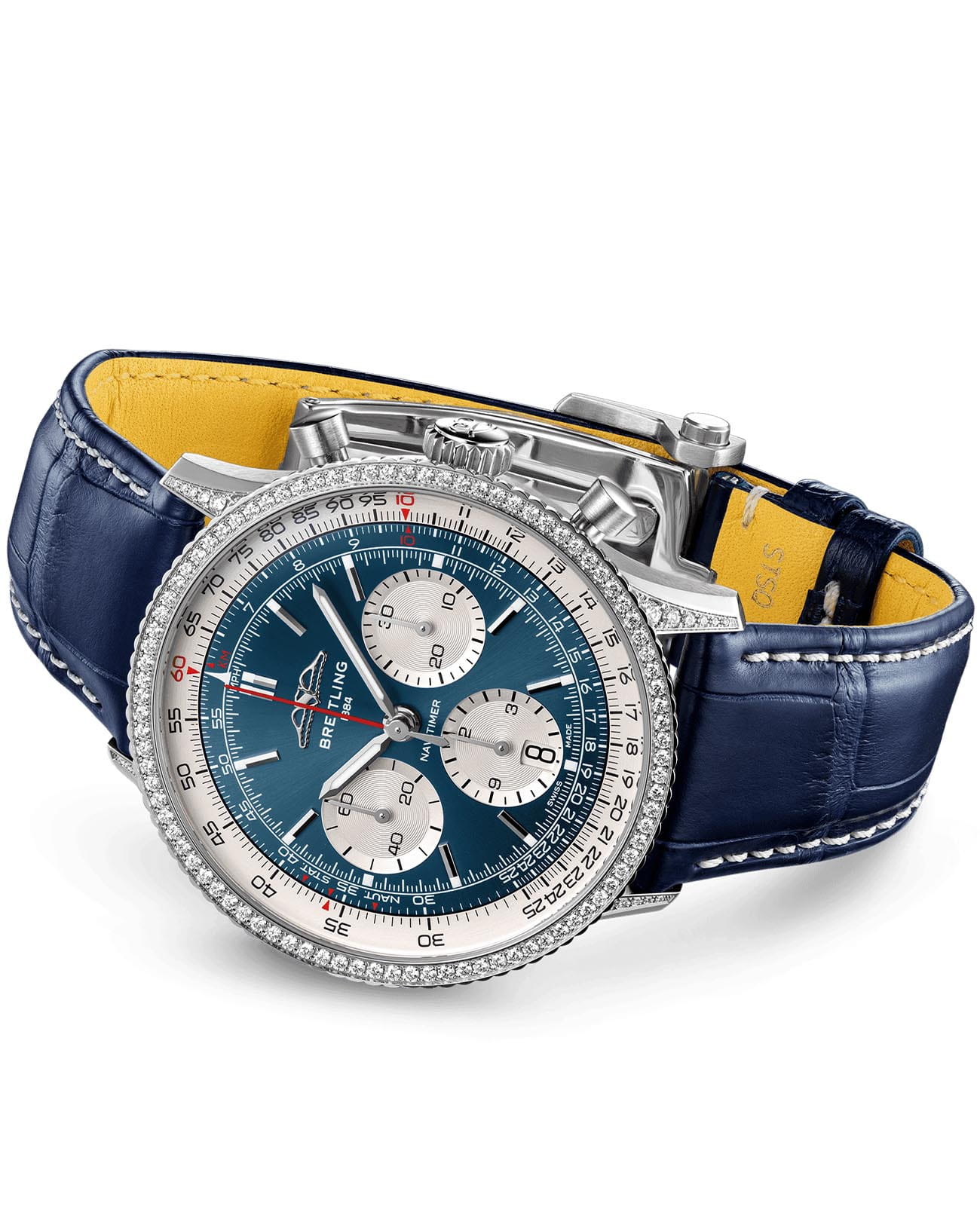 Мужские швейцарские часы-хронографХронографФункция позволяет измерять отрезки времени с особой точностью: часы, минуты, секунды. Верным признаком хронографа является наличие на циферблате 3 дополнительных окошек-счётчиков. с секундомеромСекундомерСекундоме́р — прибор, способный измерять интервалы времени с точностью до долей секунды. Breitling Navitimer B01 Chronograph 41 AB0139631C1P1, механический механизм (автоматический калибр) с высокой точностью. С момента своего дебюта 70 лет назад icon от Breitling претерпел множество модификаций, но этот новый Navitimer отражает его самые классические функции, дополняя их современными усовершенствованиями. Сплющенная логарифмическая линейка и выпуклый кристалл создают иллюзию более изящного профиля. Сапфировое стеклоСапфировое стеклоПрочный и надёжный материал из кристалла сапфира синтетического происхождения, характеризующийся особой твёрдостью и устойчивостью к царапинам и повреждениям. устойчивое к появлению царапин, обладающее высокой прозрачностью. Класс водозащиты: 30 метров, позволит защитить корпус от случайных брызг или капель дождя. Корпус часов изготовлен из стали. Ремешок из кожи аллигатора на стандартной застёжке. Шкала тахиметраТахиметрРазмеченная шкала, располагается на ободке или безеле часов. Тахиметр позволяет рассчитать скорость на определённом участке пути, расстояние измеряется в километрах или милях. на циферблате. БезельБезельВнешний ободок, закрепляющий стекло. В спортивных часах так называется поворотное кольцо с делениями на циферблате, выполняет роль таймера – замеряет отрезки времени на шкале. Неподвижный безель – элемент декора. Однонаправленно вращающийся безель на дайверских часах позволяет фиксировать моменты погружения и выныривания на поверхность. инкрустирован кристаллами. Часы имеют сертификат COSCСертификат COSCОфициальный сертификат, подтверждающий то, что часы ходят с особо высокой точностью. Для получения документа часы подвергаются тестовым испытаниям, разработанным швейцарским институтом тестирования хронометров COSC. Допустимая норма для механических часов -4/+6 секунд в день, для кварцевых моделей +/- 0,07 секунд в день.. Окошко даты находится в положении 6 часов. Часы оснащены логарифмической линейкой. Стрелки и метки с люминесцентным покрытиемЛюминесцентное покрытиеПозволяет считывать показания времени в темноте. Производители наносят на стрелки, часовые индексы, безель или поверхность циферблата светонакопительный состав, дающий холодное свечение.. И если есть одно обновление, которое наверняка вызовет ностальгию, так это возвращение крыльев AOPA в исходное положение на 12 часов. Вот уже 70 лет оригинальные часы Breitling pilot в равной степени нравятся как авиаторам, так и ценителям вкуса. Это самые культовые часы Breitling, которые носят астронавты в космосе и крупнейшие звезды на земле, и одни из самых узнаваемых часов всех времен.