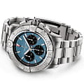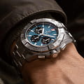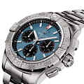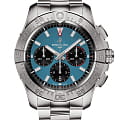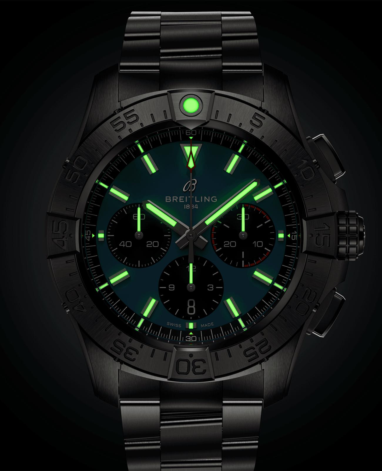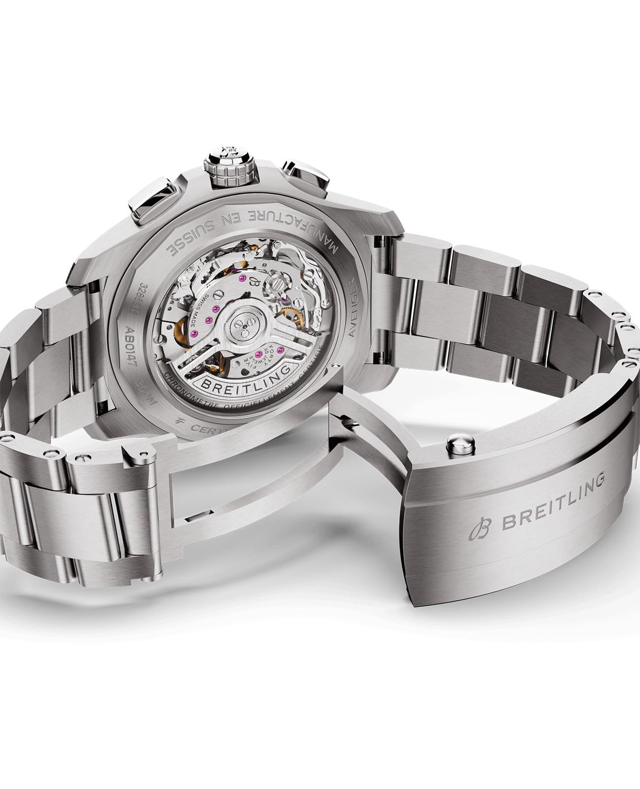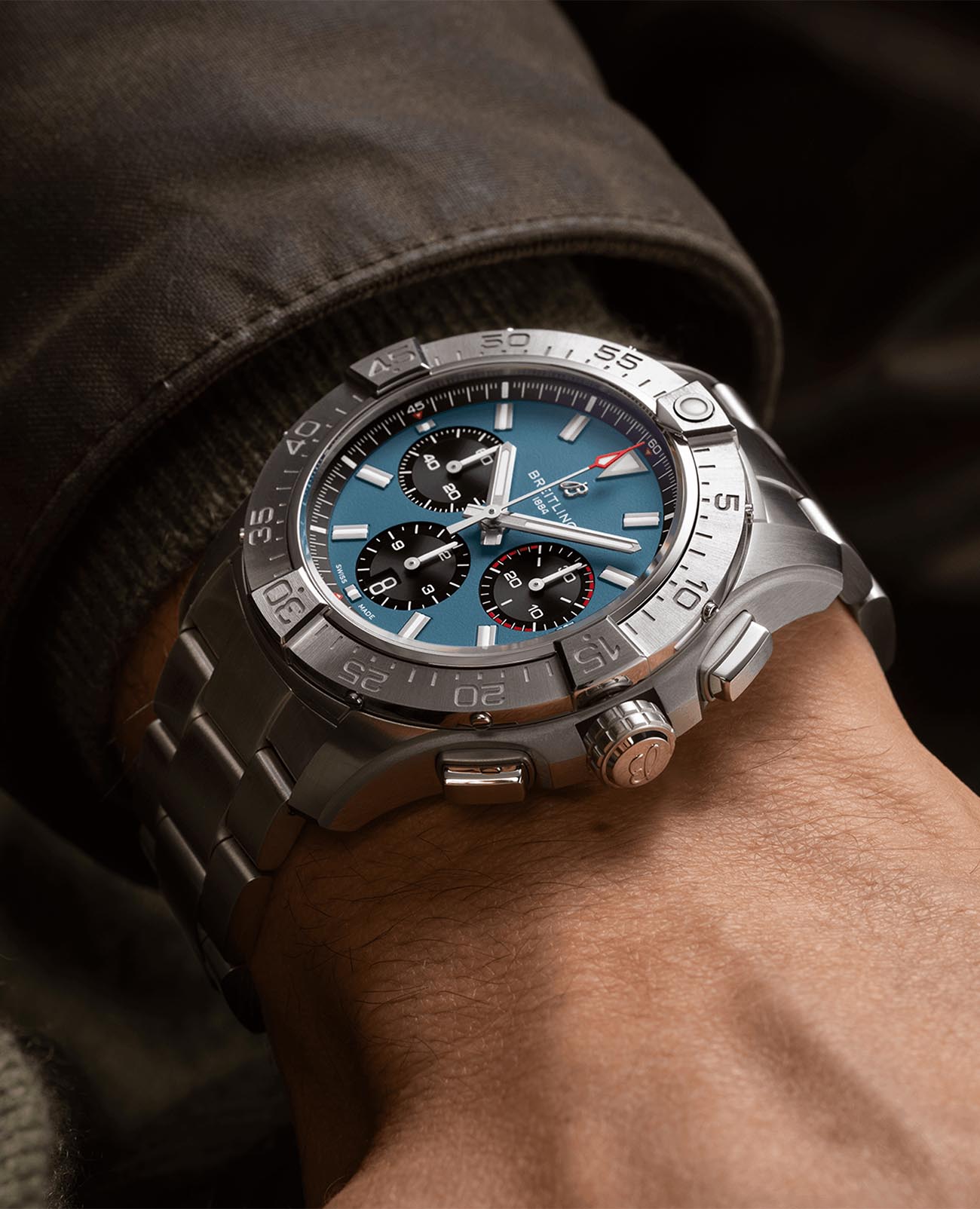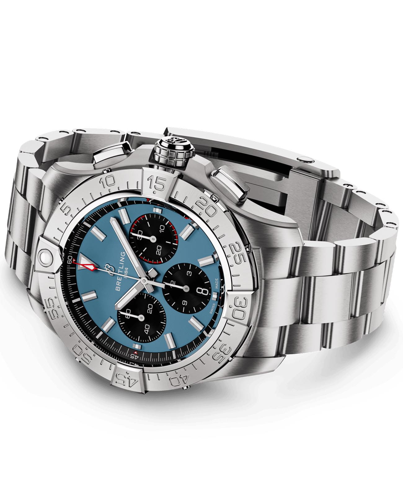 Мужские наручные часы c хронографомХронографФункция позволяет измерять отрезки времени с особой точностью: часы, минуты, секунды. Верным признаком хронографа является наличие на циферблате 3 дополнительных окошек-счётчиков. Breitling Avenger B01 Chronograph 44 AB0147101C1A1 с надёжным автоматическим механизмом. Корпус часов изготовлен из нержавеющей стали.  Сапфировое стеклоСапфировое стеклоПрочный и надёжный материал из кристалла сапфира синтетического происхождения, характеризующийся особой твёрдостью и устойчивостью к царапинам и повреждениям. с антибликовым покрытием, устойчивое к мелким механическим повреждениям. Стальной браслет с раскладной застёжкойРаскладная застёжкаТакой тип застёжки используется только на браслетах из металла. Она никогда не раскрывается полностью, происходит разделение на 2 и более частей. Раскладывающая застёжка снизит вероятность потери часов к минимуму.. Стрелки и метки с люминесцентным покрытиемЛюминесцентное покрытиеПозволяет считывать показания времени в темноте. Производители наносят на стрелки, часовые индексы, безель или поверхность циферблата светонакопительный состав, дающий холодное свечение.. Однонаправленный безельБезельВнешний ободок, закрепляющий стекло. В спортивных часах так называется поворотное кольцо с делениями на циферблате, выполняет роль таймера – замеряет отрезки времени на шкале. Неподвижный безель – элемент декора. Однонаправленно вращающийся безель на дайверских часах позволяет фиксировать моменты погружения и выныривания на поверхность.. Класс водозащиты: 300 метров, позволит плавать, нырять и заниматься другими водными видами спорта.