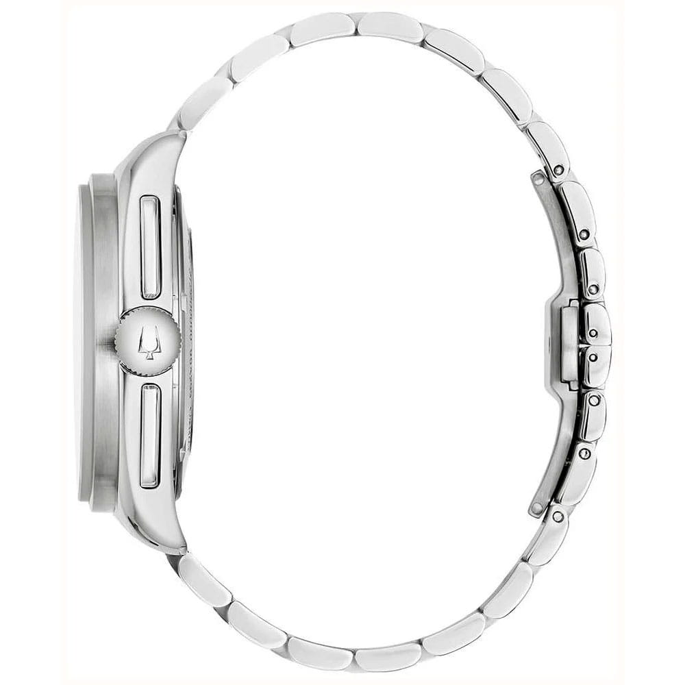 Мужские кварцевые часы-хронографХронографФункция позволяет измерять отрезки времени с особой точностью: часы, минуты, секунды. Верным признаком хронографа является наличие на циферблате 3 дополнительных окошек-счётчиков. Bulova Lunar Pilot Chronograph 96K115 – отражающий идеальное сочетание современного дизайна, надёжности и функциональности. Элегантный облик станет превосходным завершением образа, наделив его индивидуальным характером. Корпус из нержавеющей стали серебристого цвета, диаметром  43.5 мм идеально сбалансирован и элегантен. Сапфировое стеклоСапфировое стеклоПрочный и надёжный материал из кристалла сапфира синтетического происхождения, характеризующийся особой твёрдостью и устойчивостью к царапинам и повреждениям. защищает циферблат от царапин и устойчивое к мелким механическим повреждениям. Стальной браслет на застёжке-бабочке с кнопкамиЗастёжка "бабочка"Такой вид застёжки дополняется предохранителями, помогающими избежать случайного раскрытия браслета. Обладают изящным исполнением. обеспечивает комфортное ношение. Водозащита 50 метров позволит защитить корпус от случайных брызг или капель дождя. Шкала тахиметраТахиметрРазмеченная шкала, располагается на ободке или безеле часов. Тахиметр позволяет рассчитать скорость на определённом участке пути, расстояние измеряется в километрах или милях. на внешнем кольце циферблата. Стрелки и метки с люминесцентным покрытиемЛюминесцентное покрытиеПозволяет считывать показания времени в темноте. Производители наносят на стрелки, часовые индексы, безель или поверхность циферблата светонакопительный состав, дающий холодное свечение. позволяющие легко определять время даже в темноте.Эта модель – отличный выбор для тех, кто ищет сочетание стиля, качества и функциональности. Часы станут не только полезным аксессуаром, но и выразительным элементом вашего имиджа. В комплекте кожаный ремешок.