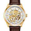 Мужские механические часы-скелетоны с автоподзаводом Bulova Sutton 97A138 – отражающий идеальное сочетание современного дизайна, надёжности и функциональности. Элегантный облик станет превосходным завершением образа, наделив его индивидуальным характером. Корпус из нержавеющей стали с IP-покрытиемIP-покрытиеМетод ионного напыления. Демонстрирует повышенную устойчивость к истиранию, окислению и химическим веществам. Под воздействием высокого давления и температуры около 1500°C молекулы металла надёжно соединяются с частицами корпуса часов. золотистого цвета, диаметром 43 мм идеально сбалансирован и элегантен. Минеральное стеклоМинеральное стеклоМинеральное стекло представляет собой искусственно выращенный минерал кварца. Такое стекло отличается особой устойчивостью к повреждениям и царапинам. Уступает по некоторым качествам сапфировому стеклу. защищает циферблат от царапин и устойчивое к мелким механическим повреждениям. Кожаный ремешок на застёжке-бабочке с кнопкамиЗастёжка "бабочка"Такой вид застёжки дополняется предохранителями, помогающими избежать случайного раскрытия браслета. Обладают изящным исполнением. обеспечивает комфортное ношение. Водозащита 30 метров позволит защитить корпус от случайных брызг или капель дождя. Стрелки с люминесцентным покрытиемЛюминесцентное покрытиеПозволяет считывать показания времени в темноте. Производители наносят на стрелки, часовые индексы, безель или поверхность циферблата светонакопительный состав, дающий холодное свечение. позволяющие легко определять время даже в темноте. Прозрачная задняя крышка. Эта модель – отличный выбор для тех, кто ищет сочетание стиля, качества и функциональности. Часы станут не только полезным аксессуаром, но и выразительным элементом вашего имиджа.