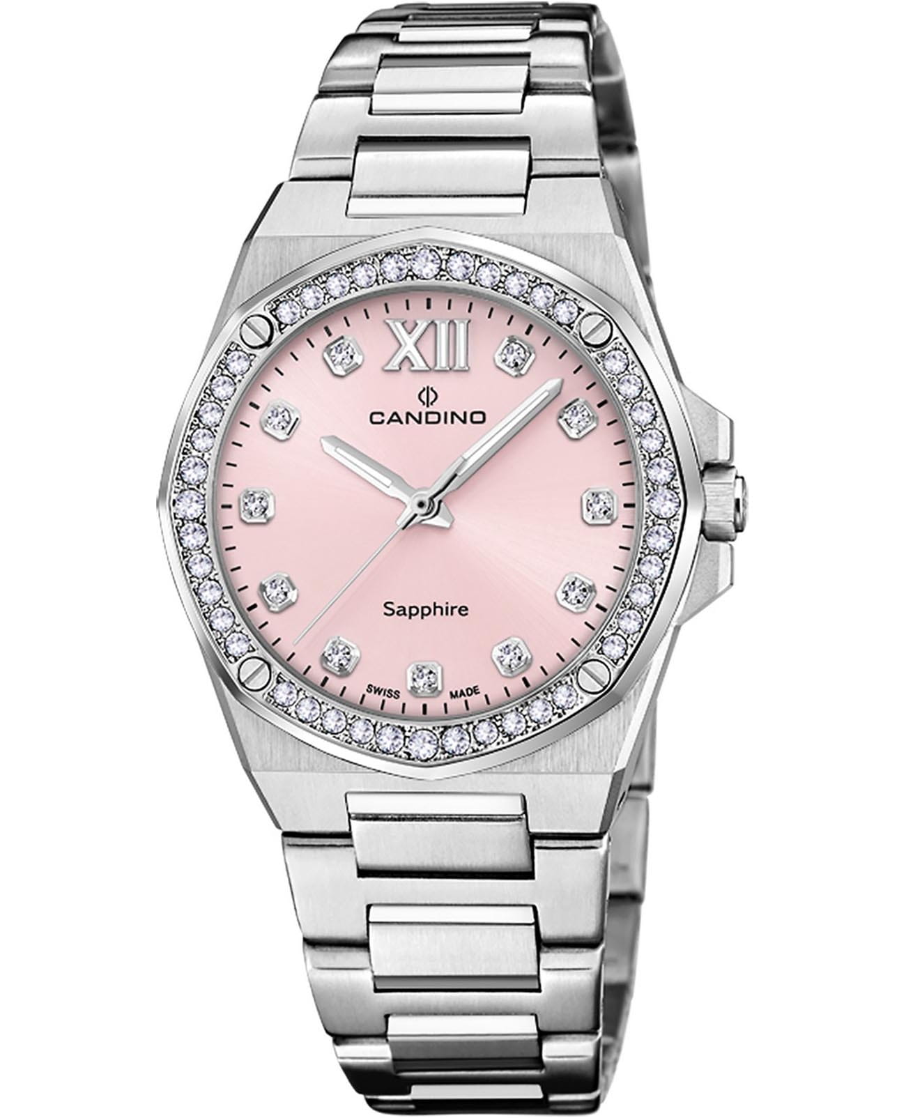 Женские наручные часы Candino Lady Elegance C4751/4 с надёжным кварцевым механизмом. Корпус и браслет часов изготовлены из нержавеющей стали. Сапфировое стеклоСапфировое стеклоПрочный и надёжный материал из кристалла сапфира синтетического происхождения, характеризующийся особой твёрдостью и устойчивостью к царапинам и повреждениям. повышенной прозрачности, устойчивое к мелким механическим повреждениям. Стальной браслет на раскладной застёжкеРаскладная застёжкаТакой тип застёжки используется только на браслетах из металла. Она никогда не раскрывается полностью, происходит разделение на 2 и более частей. Раскладывающая застёжка снизит вероятность потери часов к минимуму.. Стрелки и метки с люминесцентным покрытиемЛюминесцентное покрытиеПозволяет считывать показания времени в темноте. Производители наносят на стрелки, часовые индексы, безель или поверхность циферблата светонакопительный состав, дающий холодное свечение.. Циферблат и безельБезельВнешний ободок, закрепляющий стекло. В спортивных часах так называется поворотное кольцо с делениями на циферблате, выполняет роль таймера – замеряет отрезки времени на шкале. Неподвижный безель – элемент декора. Однонаправленно вращающийся безель на дайверских часах позволяет фиксировать моменты погружения и выныривания на поверхность. инкрустированы цирконами. Класс водозащиты: 50 метров, позволит защитить корпус от случайных брызг или капель дождя.