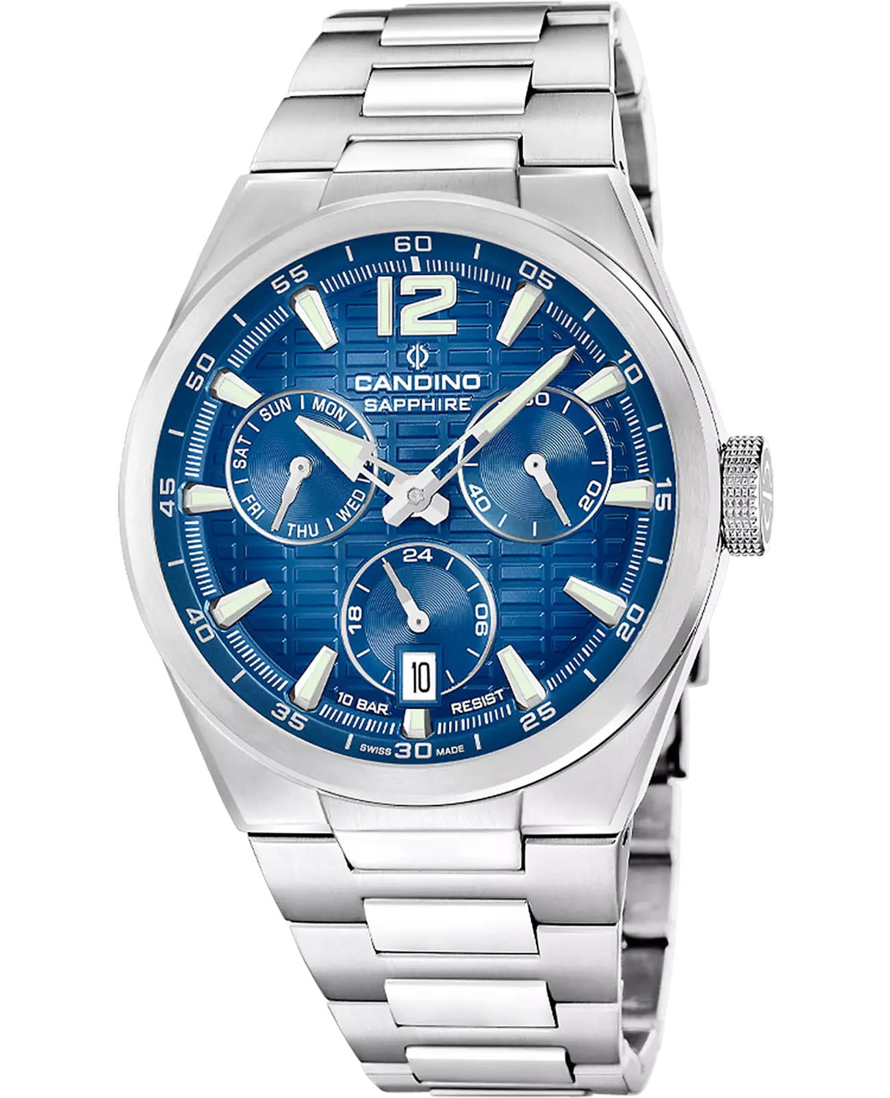 Мужские кварцевые часы Candino — это сочетание классического дизайна, надёжности и швейцарского качества. Корпус диаметром 43 мм и толщиной 11,5 мм выполнен из нержавеющей стали. Циферблат синего цвета оформлен индексами в виде штрихов и стрелками. Указатели дня недели и даты расположены в центре циферблата. Стрелки и метки с люминесцентным покрытиемЛюминесцентное покрытиеПозволяет считывать показания времени в темноте. Производители наносят на стрелки, часовые индексы, безель или поверхность циферблата светонакопительный состав, дающий холодное свечение., обеспечивающим хорошую читаемость в темноте. Циферблат защищён сапфировым стекломСапфировое стеклоПрочный и надёжный материал из кристалла сапфира синтетического происхождения, характеризующийся особой твёрдостью и устойчивостью к царапинам и повреждениям., устойчивым к царапинам. Механизм — кварцевый произведённый в Швейцарии. Часы оснащены стальным браслетом с раскладной застёжкойРаскладная застёжкаТакой тип застёжки используется только на браслетах из металла. Она никогда не раскрывается полностью, происходит разделение на 2 и более частей. Раскладывающая застёжка снизит вероятность потери часов к минимуму.. Водонепроницаемость 100 м позволяет использовать часы для плавания и повседневного ношения. Гарантия — 2 года. Идеальный выбор для тех, кто ценит стиль, функциональность и точность.