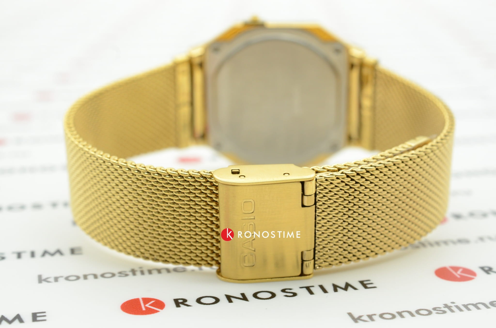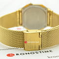 Золотистое исполнение сочетается с любой одеждой, это универсальный вариант на каждый день. Компактный корпус из полимерного пластика отлично смотрится на запястье. Модель обладает базовым функционалом: будильник, секундомер, автоматический календарь. Особый стиль придаёт браслет из нержавеющей стали 316L миланского плетения. Батарейка рассчитана на 3 года службы. Минеральное стекло препятствует образованию царапин. Габариты: 38,6 x 36,3 x 9,6 мм.