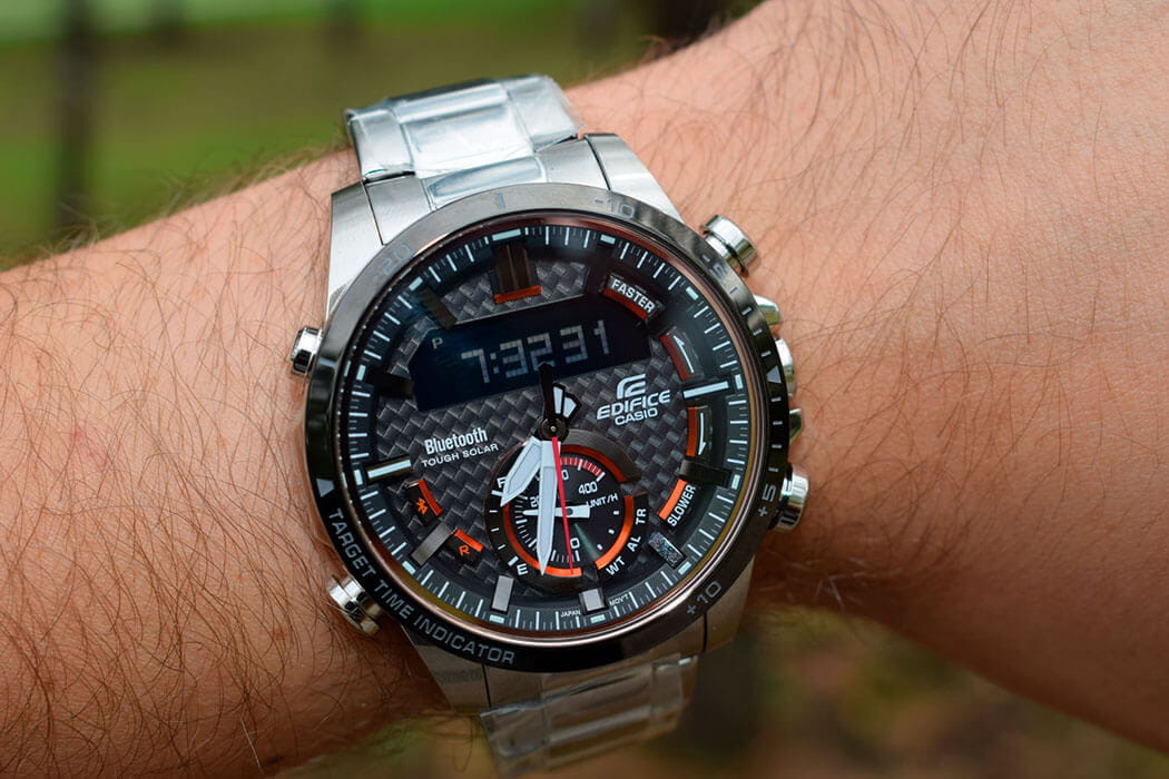 Наручные часы выполнены в автомобильной тематике, тёмный циферблат с карбоновой текстурой дополнен красными элементами. Аналого-цифровая модель со спортивным характером имеет ударопрочный корпусУдаропрочный корпусМеханизм заключён в корпус, выполненный из современных материалов, устойчивых к ударам, механическим повреждениям и падению с высоты: инновационный пластик, карбон, нержавеющая сталь, титан., из нержавеющей стали 316L, защищающий механизм от повреждений. Это часы на солнечной батарее , получающие питание от энергии солнечного света, заряд часов можно отслеживать с помощью специального индикатора. Дополнительные функции: BluetoothBluetoothСовременная технология, позволяющая синхронизировать часы с телефоном и переносить данные. Часы с Bluetooth расширяют возможности вашего смартфона и делают его использование ещё более удобным., автоматический календарь, будильник, секундомер, мировое времяМировое время Полезное часовое усложнение, отображающее время в основных городах и известных областях по всему миру, оно связано с часовыми поясами, удобно для путешественников и бизнесменов. , поиск телефона. Отображение средней скорости пройденного маршрута. Чёрное IP-покрытиеIP-покрытиеМетод ионного напыления. Демонстрирует повышенную устойчивость к истиранию, окислению и химическим веществам. Под воздействием высокого давления и температуры около 1500°C молекулы металла надёжно соединяются с частицами корпуса часов. корпуса. Минеральное стекло. Светодиодная подсветкаСветодиодная подсветкаСветодиодная или LED-подсветка обеспечивает появление яркого холодного свечения за счёт LED-элементов - маленьких лампочек. Они потребляют минимальное количество энергии, чаще всего можно встретить 1 светодиод, в нижней части циферблата.. Водонепроницаемость 10 бар. Габариты: 53,5 x 49,2 x 13,7 мм.