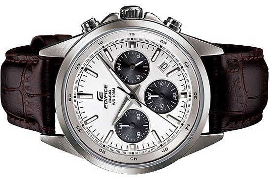 Часы оснащены функцией хронографа. Циферблат белого цвета с контрастными элементами дизайна. Стрелки и индексы с светонакопительным нанесением. Корпус выполнен из высококачественной стали с антикоррозийными свойствами. Ремешок из натуральной кожи, коричневого цвета. Минеральное стекло устойчиво к появлению царапин. Водонепроницаемость 100М. В часах можно плавать. Степень водонепроницаемости не является величиной, эквивалентной функциональной рабочей глубине.