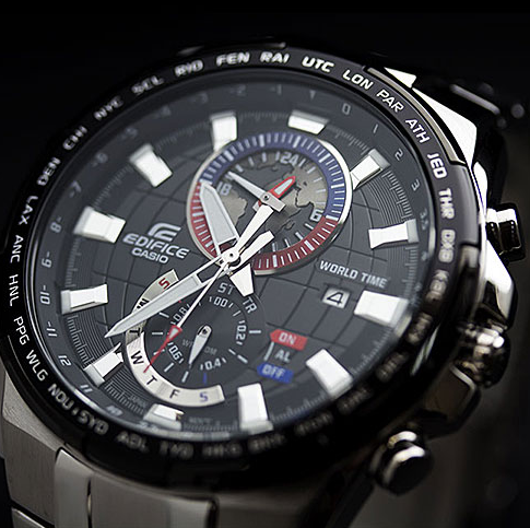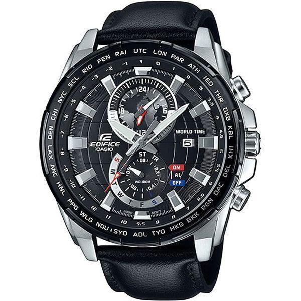 Мужские наручные часы Casio Edifice надежные и практичные. Кварцевый японский механизм Miyota. Отображение времени в различных часовых поясах с обозначением 29 основных городов в этих зонах и универсальное время. (в режиме «текущего времени» отображается индикатором на «12 часах»). Будильник (устанавливается и отображается индикатором на «6 часах»). Стрелки и индексы с светонакопительным нанесением. Корпус выполнениз высококачественной стали с антикоррозийными свойствами. Ремешок из натуральной кожи черного цвета. Минеральное стекло устойчиво к появлению царапин Циферблат - рельефный, стилизованный под картографическое изображение земного шара. Водонепроницаемость (10 Бар).