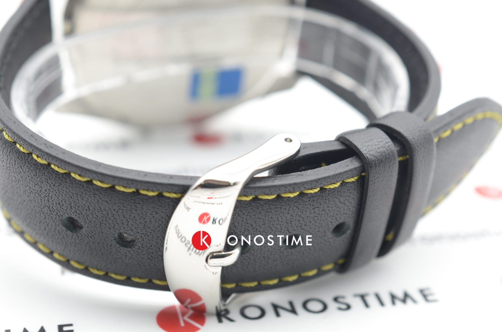 Аксессуар с автомобильным характером имеет ударопрочный корпусУдаропрочный корпусМеханизм заключён в корпус, выполненный из современных материалов, устойчивых к ударам, механическим повреждениям и падению с высоты: инновационный пластик, карбон, нержавеющая сталь, титан. из нержавеющей стали 316L, необычно смотрятся угловатые грани. На чёрном циферблате располагается множество окошек и счётчиков, но это не добавляет перегруженности. Японский кварцевый механизм с высокой точностью хода приводится в работу за счёт батарейки, рассчитанной на 3 года. БезельБезельВнешний ободок, закрепляющий стекло. В спортивных часах так называется поворотное кольцо с делениями на циферблате, выполняет роль таймера – замеряет отрезки времени на шкале. Неподвижный безель – элемент декора. Однонаправленно вращающийся безель на дайверских часах позволяет фиксировать моменты погружения и выныривания на поверхность. с чёрным IP-покрытиемIP-покрытиеМетод ионного напыления. Демонстрирует повышенную устойчивость к истиранию, окислению и химическим веществам. Под воздействием высокого давления и температуры около 1500°C молекулы металла надёжно соединяются с частицами корпуса часов.. Ремешок из натуральной кожи с жёлтой прострочкой. Водостойкость 10 бар. Завинчивающаяся задняя крышка. Минеральное стекло. Крупная индикация даты, хронографХронографФункция позволяет измерять отрезки времени с особой точностью: часы, минуты, секунды. Верным признаком хронографа является наличие на циферблате 3 дополнительных окошек-счётчиков., секундомер. Габариты: 44,6 x 50 x 12,4 мм.