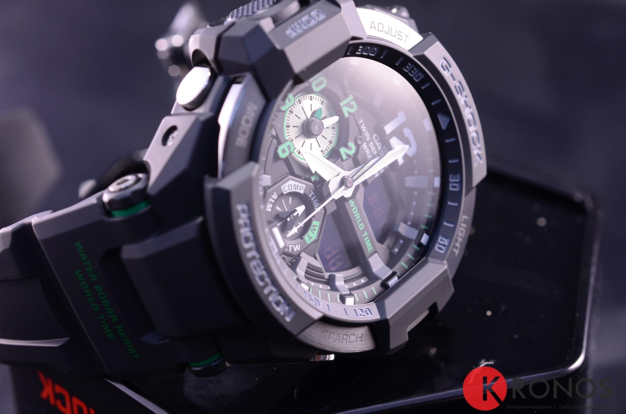 Ударопрочная конструкция защищает от ударов и вибрации. Светящееся покрытие обеспечивает длительную подсветку в темное время суток после короткого воздействия света. Встроенный цифровой компас определяет северный магнитный полюс. Датчик измеряет температуру окружающего воздуха вокруг часов и отображает ее на экране в градусах  °C (-10°C /+60°C). Отображение текущего времени в основных городах и конкретных областях по всему миру. Функция секундомера - 1/100 сек. - 1 час. Для поклонников точности: таймеры обратного отсчета напомнят Вам о текущих или особенных событиях, издав звуковой сигнал в установленное время.  Время можно предварительно настроить от 1 минуты и до 1 часа. Нажатие на кнопку обеспечит перемещение стрелок в такое положение, которое позволит Вам легко считать информацию с маленьких цифровых дисплеев – например, дату или показатели секундомера. Можно отключить звук при нажатии кнопок.  Автоматический календарь. Прочное, устойчивое к царапинам минеральное стекло защищает часы от повреждений. Корпус из нержавеющей стали и полимерного пластика. Ремешок из полимерного материала. Водонепроницаемость (20 Бар). Идеально подходит для ныряния без акваланга.