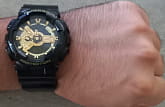 Многофункциональные часы имеют противоударный корпусУдаропрочный корпусМеханизм заключён в корпус, выполненный из современных материалов, устойчивых к ударам, механическим повреждениям и падению с высоты: инновационный пластик, карбон, нержавеющая сталь, титан. из пластика, способного выдерживать большие нагрузки и повреждения. Стильно смотрится чёрный циферблат с крупными элементами золотистого цвета. Модель оснащена кварцевым механизмом, батарейка рассчитана на 2 года работы. Автоматическая светодиодная подсветкаСветодиодная подсветкаСветодиодная или LED-подсветка обеспечивает появление яркого холодного свечения за счёт LED-элементов - маленьких лампочек. Они потребляют минимальное количество энергии, чаще всего можно встретить 1 светодиод, в нижней части циферблата.. Удобный полимерный ремешок. Водостойкость до 20 бар. Минеральное стекло. Функции: определение скорости преодолённого владельцем пути, будильник с возможностью повтора, автоматический календарь, мировое времяМировое время Полезное часовое усложнение, отображающее время в основных городах и известных областях по всему миру, оно связано с часовыми поясами, удобно для путешественников и бизнесменов. , секундомер. Габариты: 55 x 51,2 x 16,9 мм.