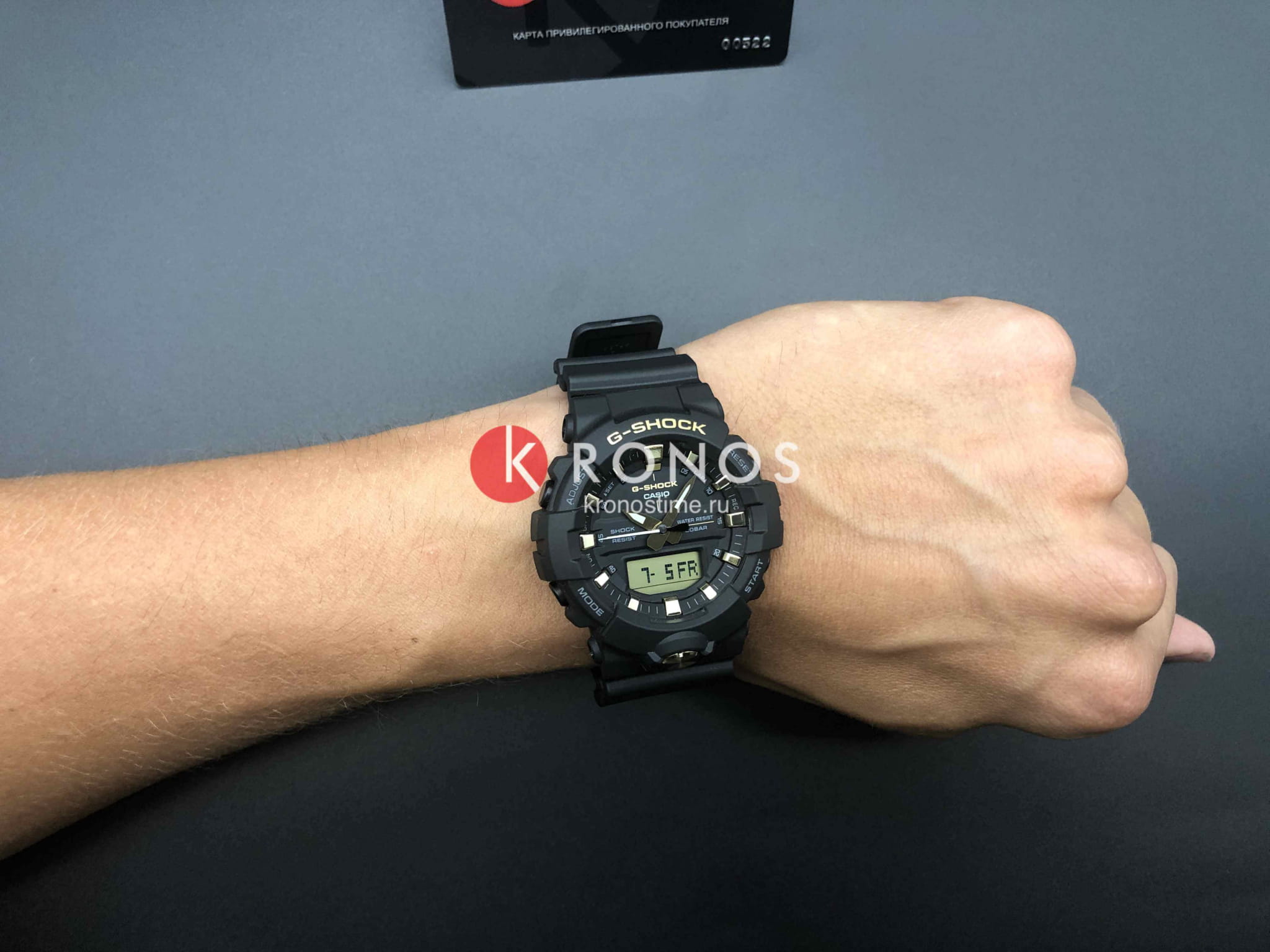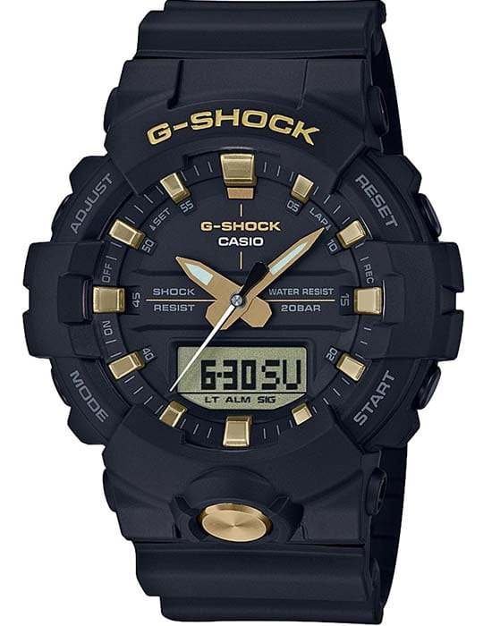 Стильная фешн-модель из серии G-SHOCK GA-800 в черном корпусе с деталями циферблата и корпуса цвета золота. Внешне часы данной серии схожи с джишоками GA-700, однако 800-серия получила уменьшенный размер корпуса и теперь вам не нужно обладать запястьем геракла, чтобы комфортно носить любимые шоки!