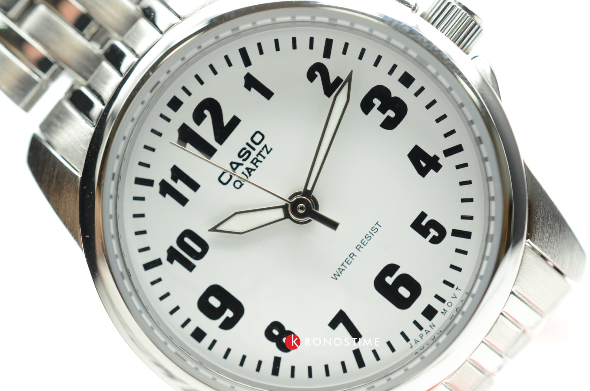 Гладкий, слегка отсвечивающий корпус серебристого цвета закреплен к элегантному браслету из нержавеющей стали. На круглом циферблате расположены крупные арабские цифры и стрелки, выгодно сочетающие в себе светло-зеленый и черный света. Простота дизайна, удобство и соблюдение правильных пропорций — вот главные преимущества данной модели. Кварцевый механизм. Срок службы батарейки составляет 3 года.