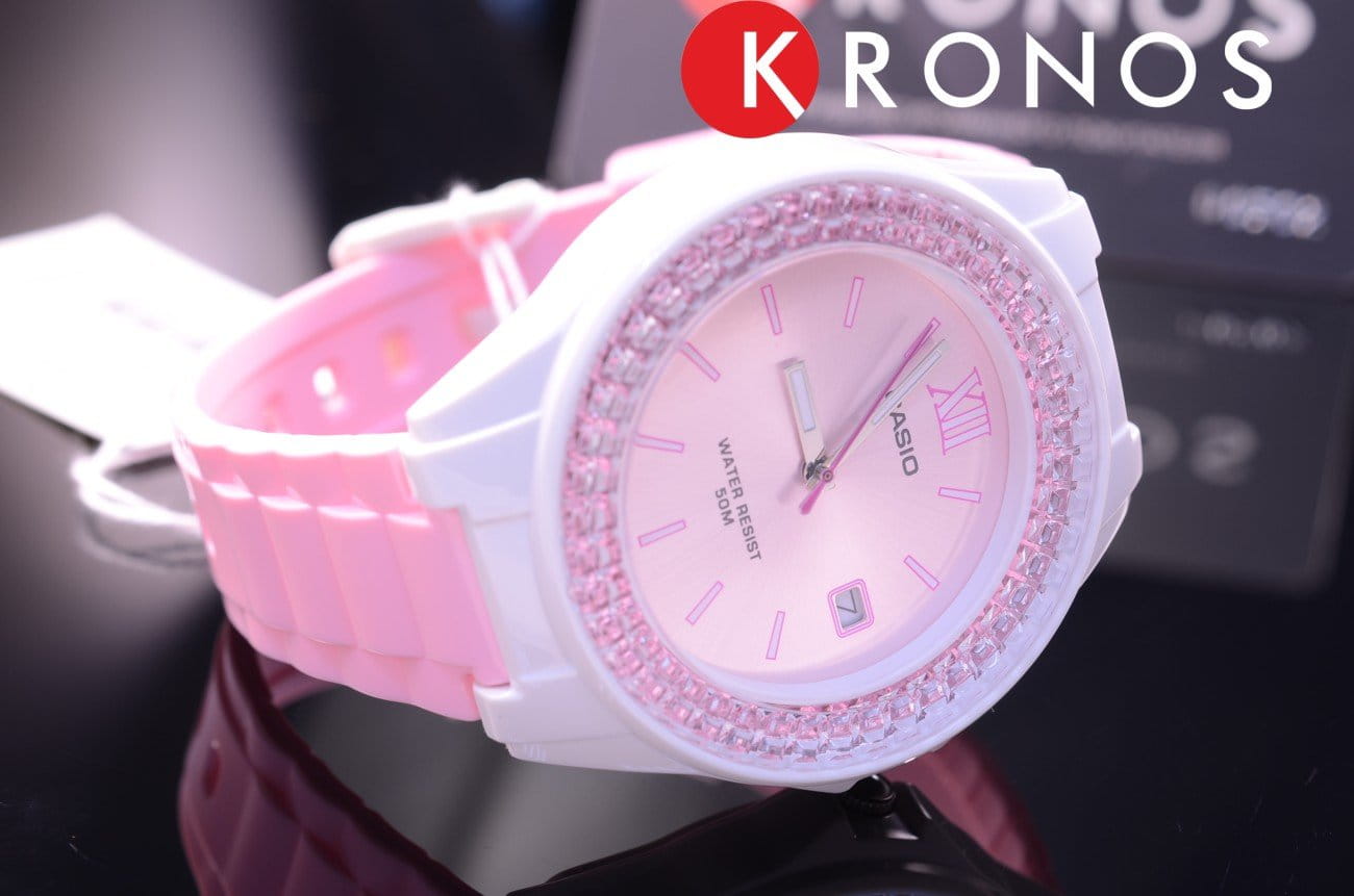 Корпус аккуратных и ярких наручных часов от Casio сделан из пластика. Яркий безельБезельВнешний ободок, закрепляющий стекло. В спортивных часах так называется поворотное кольцо с делениями на циферблате, выполняет роль таймера – замеряет отрезки времени на шкале. Неподвижный безель – элемент декора. Однонаправленно вращающийся безель на дайверских часах позволяет фиксировать моменты погружения и выныривания на поверхность. вокруг циферблата отражает падающий свет и добавляет аксессуару привлекательности. На круглом циферблате серебристого цвета расположены аккуратные римские цифры и штрихи. Благодаря кварцевому механизму отсутствует необходимость каждый раз заводить часы. Благодаря подсветке NeobriteПодсветка NeobriteИспользование светонакопительных составов на основе сульфида цинка или алюмината стронция, яркий свет можно наблюдать на протяжении 6-10 часов после «зарядки» часов около источника света. узнать информацию на циферблате легко даже в темное время суток. Водонепроницаемость составляет 50 WR.