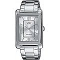 Строгие мужские часы в прямоугольном корпусе. Корпус - Латунь; Стекло - Минеральное; Водозащита - 30 м. (WR 30); Материал ремешка - Латунь; Цвет ремешка - Серебристый; Цвет циферблата - Серебряный.