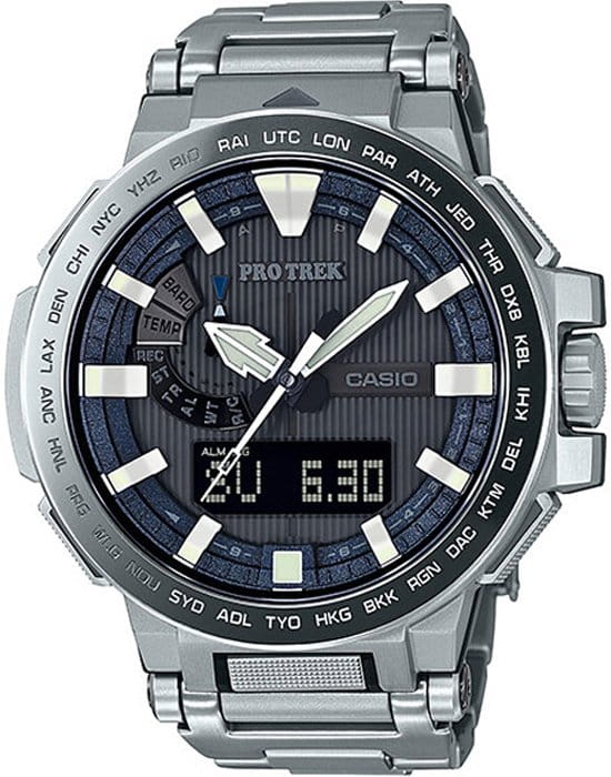 PRX-8000GT-7PR - модель, которая на сегодняшний день считается одной из лучших для занятий профессиональным альпинизмом Сверхнадежные часы отличаются не только премиальным дизайном, богатым набором функций, но и превосходной считываемостью информации, поэтому спокойно могут быть использованы альпинистами даже на высоте 8 километров Самые ключевые детали корпуса этой модели выполнены из высокопрочного сплава титана, который для дополнительной стойкости покрыт слоем карбида титана Корона часов, безель и все кнопки обработаны покрытием DLC (углеродное алмазное вещество) Циферблат со стрелками с двойной люминесцентной обработкой для лучшей видимости в темноте покрыт сверхпрочным сапфировым стеклом PRX-8000GT-7PR имеют максимальную защиту, поэтому не боятся ни ударов, ни вибрации, ни погружения в воду (до 100 метров), ни перепадов температур (до -10°C), да и трудно найти что-то такое, что могло бы их сильно повредить Конечно, при желании можно разбить любые защищенные часы, но в альпинизме, где всякое случается, модель PRX-8000T – это самый надежный помощник, который точно не подведет