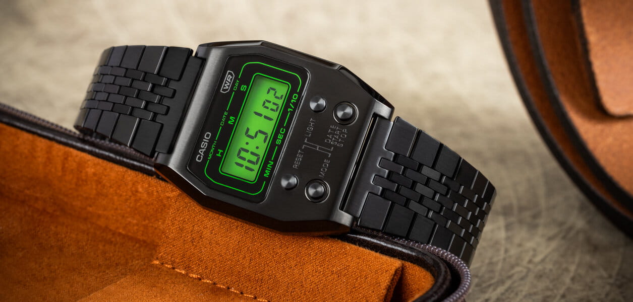Спортивные японские мужские часы с секундомеромСекундомерСекундоме́р — прибор, способный измерять интервалы времени с точностью до долей секунды. Casio Vintage A1100B-1, кварцевый механизм с высокой точностью. Издавая звуковой сигнал в установленное время, будильникБудильникБуди́льник — часы, в заданный момент времени подающие звуковой, световой и/или в редких случаях другой сигнал. напоминает о событиях, которые повторяются каждый день. Корпус и браслет часов изготовлены из нержавеющей стали с IP-покрытиемIP-покрытиеМетод ионного напыления. Демонстрирует повышенную устойчивость к истиранию, окислению и химическим веществам. Под воздействием высокого давления и температуры около 1500°C молекулы металла надёжно соединяются с частицами корпуса часов.. Класс водозащиты: 30 метров, позволит защитить корпус от случайных брызг или капель дождя. Стальной браслет на раскладной застёжкеРаскладная застёжкаТакой тип застёжки используется только на браслетах из металла. Она никогда не раскрывается полностью, происходит разделение на 2 и более частей. Раскладывающая застёжка снизит вероятность потери часов к минимуму..