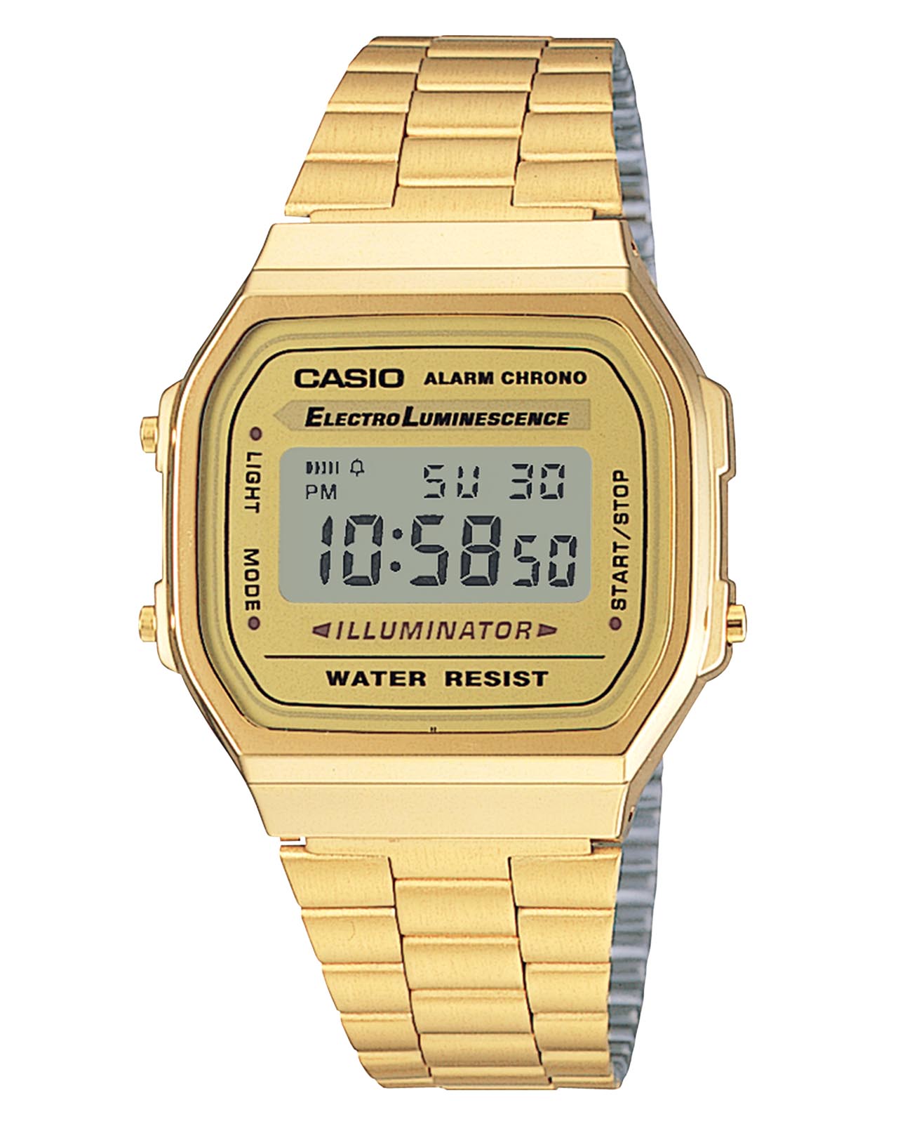 Японские мужские часы с хронографом Casio Vintage A168WG-9WDF (A168WG-9W), кварцевый механизм с высокой точностью. Класс водозащиты: 30 метров, позволит защитить корпус от случайных брызг или капель дождя. Корпус часов изготовлен из пластика, золотистого цвета.