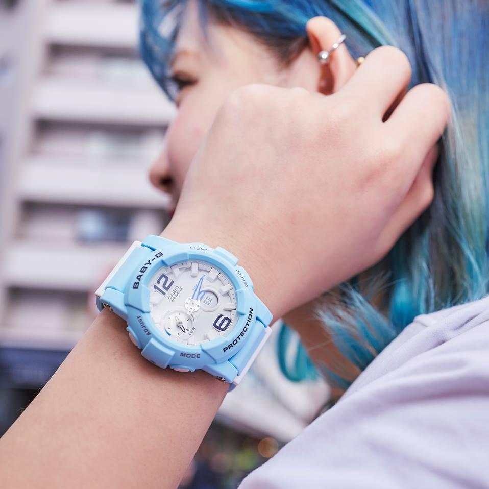 Женские противоударные японские наручные часы Casio Baby-G BGA-180BE-2B, кварцевый механизм с высокой точностью. Класс водозащиты: 100 метров, позволит плавать, нырять и заниматься другими водными видами спорта. Корпус часов изготовлен из пластика, голубого цвета.